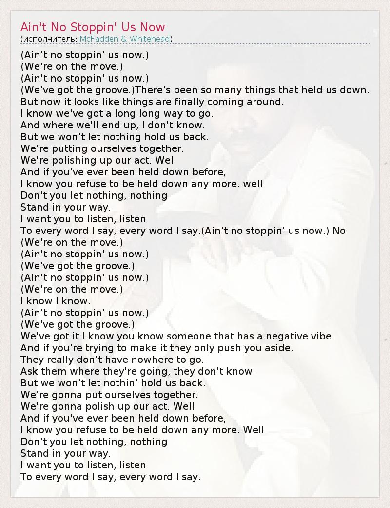 (Ain't no stoppin' us now.) (We're on the move.) (Ain't no stoppin' us now.) (We've got the groove.)There's been so many things that held us down. But now it looks like things are finally coming around. I know we've got a long long way to go. And where we'll end up, I don't know. But we won't let nothing hold us back. We're putting ourselves together. We're polishing up our act. Well And if you've ever been held down before, I know you refuse to be held down any more. well Don't you let nothing, nothing Stand in your way. I want you to listen, listen To every word I say, every word I say.(Ain't no stoppin' us now.) No (We're on the move.) (Ain't no stoppin' us now.) (We've got the groove.) (Ain't no stoppin' us now.) (We're on the move.) I know I know. (Ain't no stoppin' us now.) (We've got the groove.) We've got it.I know you know someone that has a negative vibe. And if you're trying to make it they only push you aside. They really don't have nowhere to go. Ask them where they're going, they don't know. But we won't let nothin' hold us back. We're gonna put ourselves together. We're gonna polish up our act. Well And if you've ever been held down before, I know you refuse to be held down any more. Well Don't you let nothing, nothing Stand in your way. I want you to listen, listen To every word I say, every word I say.