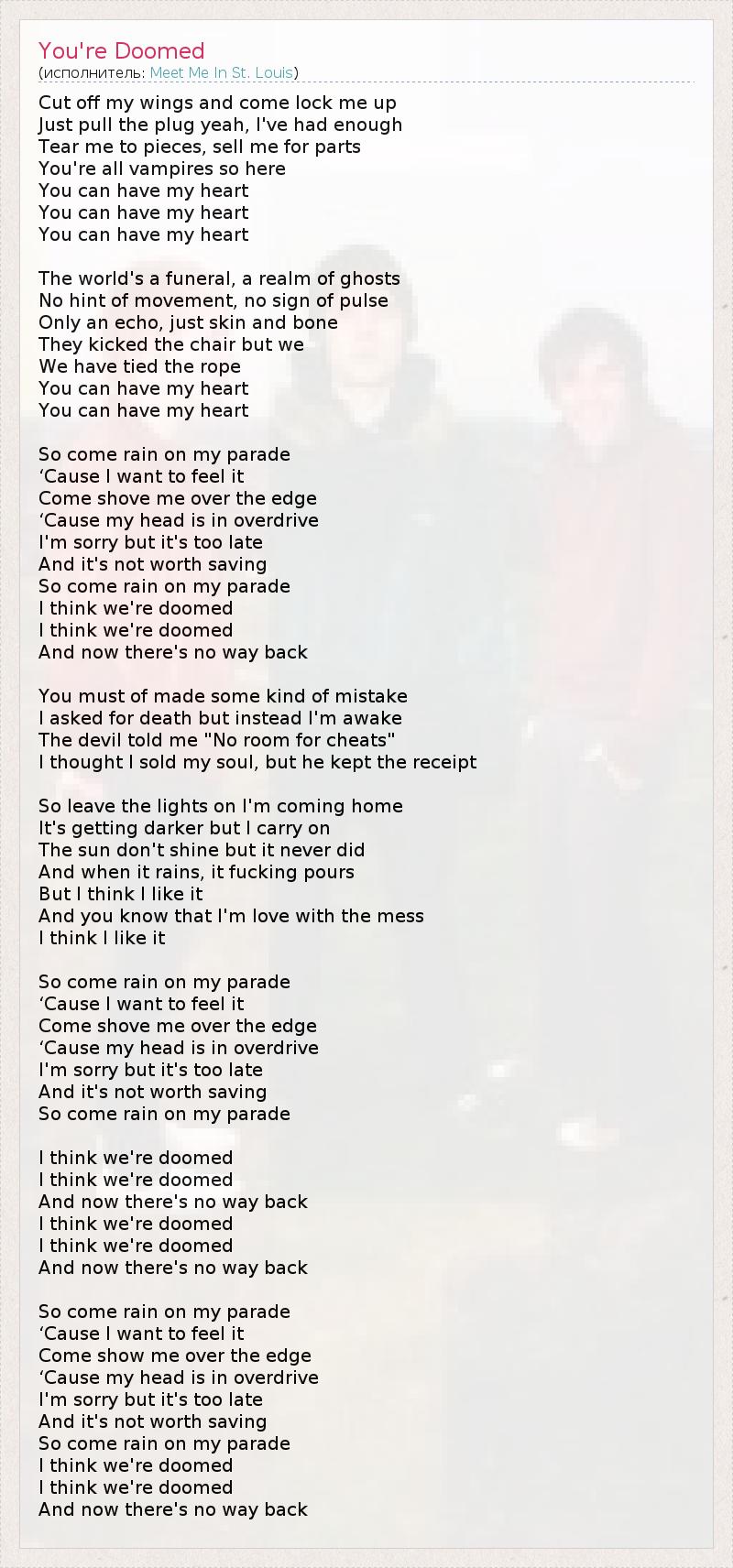 Cut off my wings and come lock me up Just pull the plug yeah, I've had enough Tear me to pieces, sell me for parts You're all vampires so here You can have my heart You can have my heart You can have my heart The world's a funeral, a realm of ghosts No hint of movement, no sign of pulse Only an echo, just skin and bone They kicked the chair but we We have tied the rope You can have my heart You can have my heart So come rain on my parade ‘Cause I want to feel it Come shove me over the edge ‘Cause my head is in overdrive I'm sorry but it's too late And it's not worth saving So come rain on my parade I think we're doomed I think we're doomed And now there's no way back You must of made some kind of mistake I asked for death but instead I'm awake The devil told me "No room for cheats" I thought I sold my soul, but he kept the receipt So leave the lights on I'm coming home It's getting darker but I carry on The sun don't shine but it never did And when it rains, it fucking pours But I think I like it And you know that I'm love with the mess I think I like it So come rain on my parade ‘Cause I want to feel it Come shove me over the edge ‘Cause my head is in overdrive I'm sorry but it's too late And it's not worth saving So come rain on my parade I think we're doomed I think we're doomed And now there's no way back I think we're doomed I think we're doomed And now there's no way back So come rain on my parade ‘Cause I want to feel it Come show me over the edge ‘Cause my head is in overdrive I'm sorry but it's too late And it's not worth saving So come rain on my parade I think we're doomed I think we're doomed And now there's no way back
