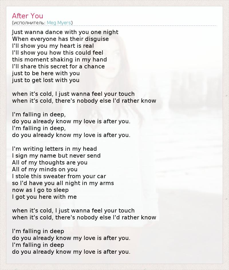 Просто хочу танцевать с тобой однажды ночью Когда у всех есть их маскировку Я покажу вам мое сердце в режиме реального Я покажу вам, как это может чувствовать себя этот момент встряхивания в моей руке Я поделюсь эту тайну за шанс просто чтобы быть здесь с вами просто заблудиться с вами когда холодно , я просто хочу почувствовать твое прикосновение когда холодно , там больше никого нет , я бы предпочел знать Я падаю в глубокий, Вы уже знаете, моя любовь после вас. Я падаю в глубокий, Вы уже знаете, моя любовь после вас. Я пишу письма в моей голове Я не подписать мое имя , но не отправляет Все мои мысли ты Все мои умы на вас Я украл этот свитер от вашего автомобиля так что я должен был бы вас всю ночь у меня на руках сейчас, когда я иду спать Я держу тебя здесь со мной когда холодно , я просто хочу почувствовать твое прикосновение когда холодно , там больше никого нет , я бы предпочел знать Я падаю в глубокий Вы уже знаете, моя любовь после вас. Я падаю в глубокий Вы уже знаете, моя любовь после вас.
