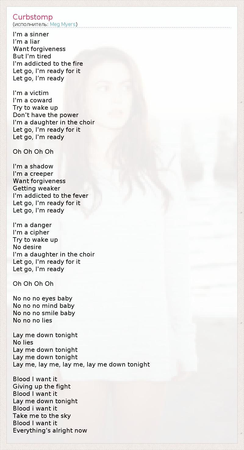 I'm a sinner I’m a liar Want forgiveness But I'm tired I'm addicted to the fire Let go, I'm ready for it Let go, I’m ready I'm a victim I'm a coward Try to wake up Don't have the power I'm a daughter in the choir Let go, I'm ready for it Let go, I'm ready Oh Oh Oh Oh I'm a shadow I'm a creeper Want forgiveness Getting weaker I'm addicted to the fever Let go, I'm ready for it Let go, I'm ready I'm a danger I'm a cipher Try to wake up No desire I'm a daughter in the choir Let go, I'm ready for it Let go, I'm ready Oh Oh Oh Oh No no no eyes baby No no no mind baby No no no smile baby No no no lies Lay me down tonight No lies Lay me down tonight Lay me down tonight Lay me, lay me, lay me, lay me down tonight Blood I want it Giving up the fight Blood I want it Lay me down tonight Blood i want it Take me to the sky Blood I want it Everything's alright now
