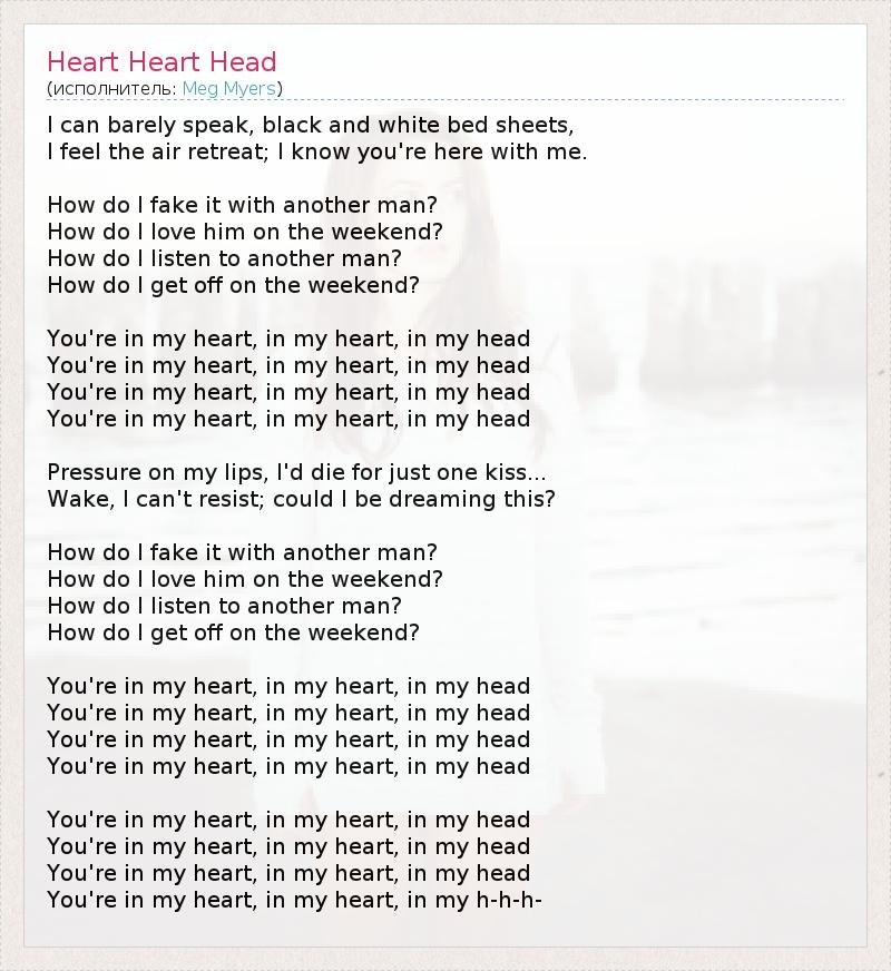 I can barely speak, black and white bed sheets, I feel the air retreat; I know you're here with me. How do I fake it with another man? How do I love him on the weekend? How do I listen to another man? How do I get off on the weekend? You're in my heart, in my heart, in my head You're in my heart, in my heart, in my head You're in my heart, in my heart, in my head You're in my heart, in my heart, in my head Pressure on my lips, I'd die for just one kiss... Wake, I can't resist; could I be dreaming this? How do I fake it with another man? How do I love him on the weekend? How do I listen to another man? How do I get off on the weekend? You're in my heart, in my heart, in my head You're in my heart, in my heart, in my head You're in my heart, in my heart, in my head You're in my heart, in my heart, in my head You're in my heart, in my heart, in my head You're in my heart, in my heart, in my head You're in my heart, in my heart, in my head You're in my heart, in my heart, in my h-h-h-