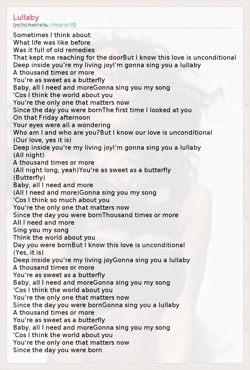 Sometimes I think about What life was like before Was it full of old remedies That kept me reaching for the doorBut I know this love is unconditional Deep inside you're my living joyI'm gonna sing you a lullaby A thousand times or more You're as sweet as a butterfly Baby, all I need and moreGonna sing you my song 'Cos I think the world about you You're the only one that matters now Since the day you were bornThe first time I looked at you On that Friday afternoon Your eyes were all a wondering Who am I and who are you?But I know our love is unconditional (Our love, yes it is) Deep inside you're my living joyI'm gonna sing you a lullaby (All night) A thousand times or more (All night long, yeah)You're as sweet as a butterfly (Butterfly) Baby, all I need and more (All I need and more)Gonna sing you my song 'Cos I think so much about you You're the only one that matters now Since the day you were bornThousand times or more All I need and more Sing you my song Think the world about you Day you were bornBut I know this love is unconditional (Yes, it is) Deep inside you're my living joyGonna sing you a lullaby A thousand times or more You're as sweet as a butterfly Baby, all I need and moreGonna sing you my song 'Cos I think the world about you You're the only one that matters now Since the day you were bornGonna sing you a lullaby A thousand times or more You're as sweet as a butterfly Baby, all I need and moreGonna sing you my song 'Cos I think the world about you You're the only one that matters now Since the day you were born