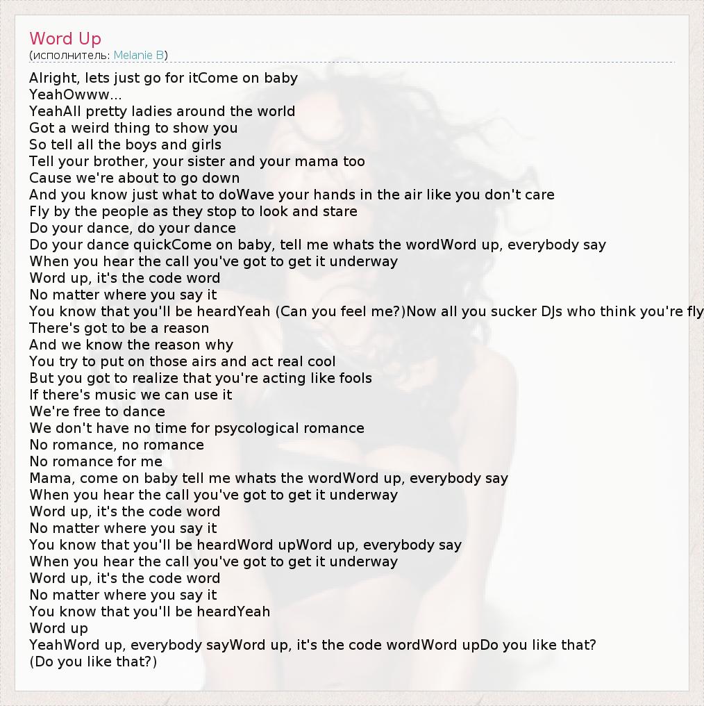 Alright, lets just go for itCome on baby YeahOwww... YeahAll pretty ladies around the world Got a weird thing to show you So tell all the boys and girls Tell your brother, your sister and your mama too Cause we're about to go down And you know just what to doWave your hands in the air like you don't care Fly by the people as they stop to look and stare Do your dance, do your dance Do your dance quickCome on baby, tell me whats the wordWord up, everybody say When you hear the call you've got to get it underway Word up, it's the code word No matter where you say it You know that you'll be heardYeah (Can you feel me?)Now all you sucker DJs who think you're fly There's got to be a reason And we know the reason why You try to put on those airs and act real cool But you got to realize that you're acting like fools If there's music we can use it We're free to dance We don't have no time for psycological romance No romance, no romance No romance for me Mama, come on baby tell me whats the wordWord up, everybody say When you hear the call you've got to get it underway Word up, it's the code word No matter where you say it You know that you'll be heardWord upWord up, everybody say When you hear the call you've got to get it underway Word up, it's the code word No matter where you say it You know that you'll be heardYeah Word up YeahWord up, everybody sayWord up, it's the code wordWord upDo you like that? (Do you like that?)
