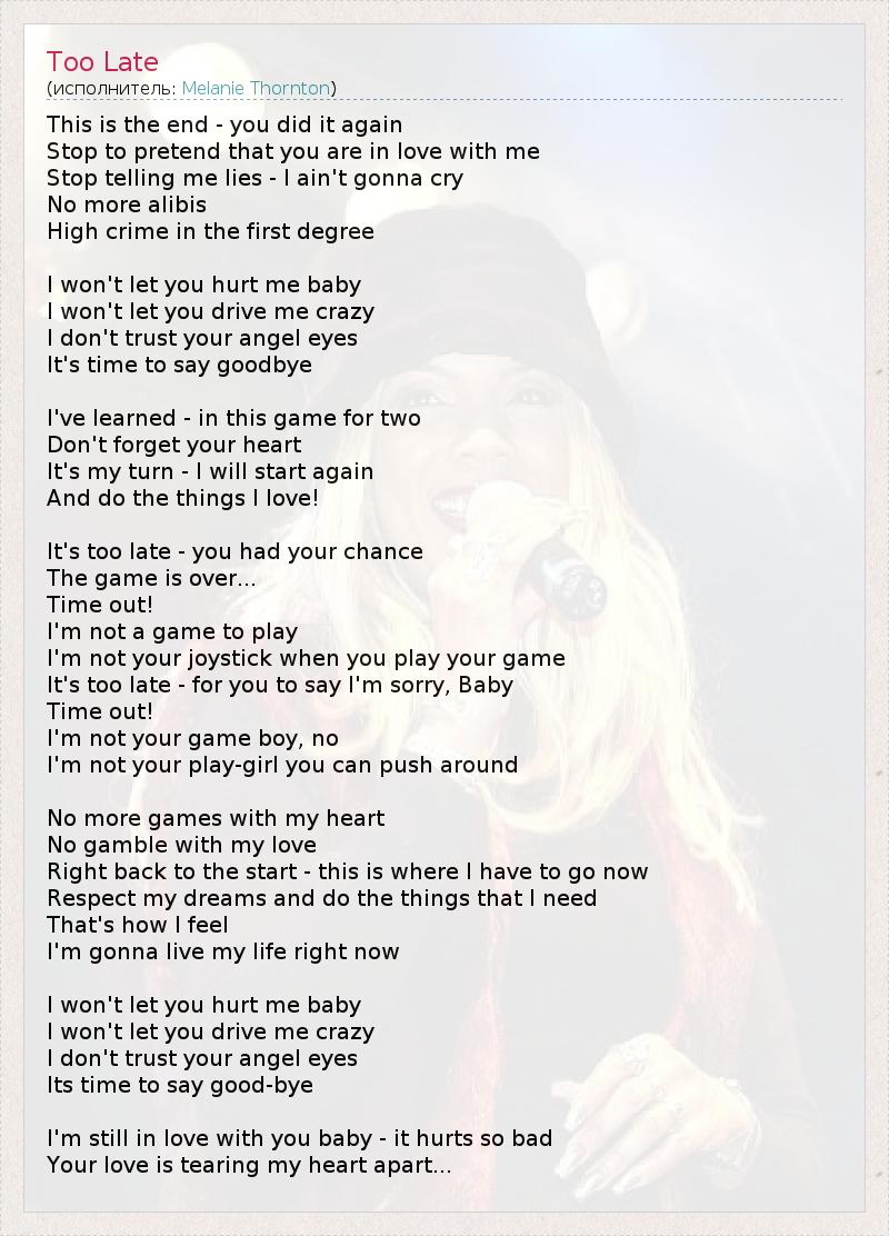 This is the end - you did it again Stop to pretend that you are in love with me Stop telling me lies - I ain't gonna cry No more alibis High crime in the first degree I won't let you hurt me baby I won't let you drive me crazy I don't trust your angel eyes It's time to say goodbye I've learned - in this game for two Don't forget your heart It's my turn - I will start again And do the things I love! It's too late - you had your chance The game is over... Time out! I'm not a game to play I'm not your joystick when you play your game It's too late - for you to say I'm sorry, Baby Time out! I'm not your game boy, no I'm not your play-girl you can push around No more games with my heart No gamble with my love Right back to the start - this is where I have to go now Respect my dreams and do the things that I need That's how I feel I'm gonna live my life right now I won't let you hurt me baby I won't let you drive me crazy I don't trust your angel eyes Its time to say good-bye I'm still in love with you baby - it hurts so bad Your love is tearing my heart apart...