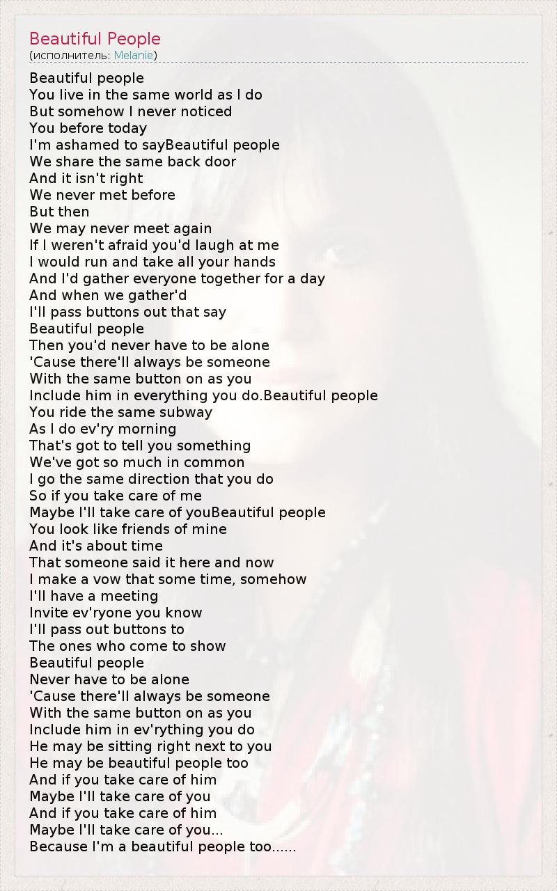 Beautiful people You live in the same world as I do But somehow I never noticed You before today I'm ashamed to sayBeautiful people We share the same back door And it isn't right We never met before But then We may never meet again If I weren't afraid you'd laugh at me I would run and take all your hands And I'd gather everyone together for a day And when we gather'd I'll pass buttons out that say Beautiful people Then you'd never have to be alone 'Cause there'll always be someone With the same button on as you Include him in everything you do.Beautiful people You ride the same subway As I do ev'ry morning That's got to tell you something We've got so much in common I go the same direction that you do So if you take care of me Maybe I'll take care of youBeautiful people You look like friends of mine And it's about time That someone said it here and now I make a vow that some time, somehow I'll have a meeting Invite ev'ryone you know I'll pass out buttons to The ones who come to show Beautiful people Never have to be alone 'Cause there'll always be someone With the same button on as you Include him in ev'rything you do He may be sitting right next to you He may be beautiful people too And if you take care of him Maybe I'll take care of you And if you take care of him Maybe I'll take care of you... Because I'm a beautiful people too......