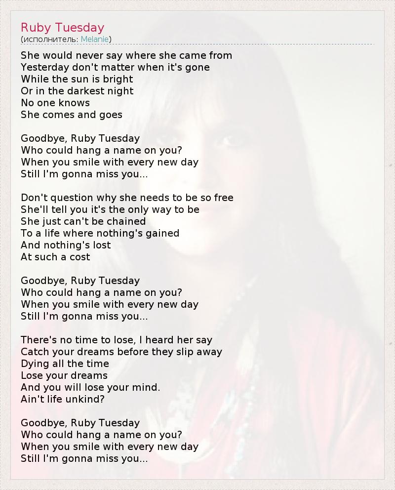 Она никогда никому не рассказывает, откуда приходит. К чему вспоминать о вчерашнем дне, если он уже ушёл? Светит ли ярко солнце, Глубокая ли ночь за окном, - Никто не знает, Когда она придёт - и уйдёт вновь. Прощай, Руби Тьюсдей. Кто окрестил так тебя? Что б ни случилось, ты всегда улыбаешься... И всё же мне будет не хватать тебя. Не спрашивай, отчего она так нуждается в свободе - Она ответит, что только так и можно жить. Она не хочет быть прикованной К жизни, в которой ничего нельзя выиграть - И ничего нельзя потерять За такую-то цену... Прощай, Руби Тьюсдей. Кто окрестил так тебя? Что б ни случилось, ты всегда улыбаешься... И всё же мне будет не хватать тебя. Я слышал,она говорила: времени нет, Держись крепче за свои мечты, чтобы они не ускользнули от тебя, Не умерли, не угасли... Если ты потеряешь то, во что веришь, То потеряешь и разум: Не жестока ли, право, жизнь?.. Прощай, Руби Тьюсдей. Кто окрестил так тебя? Что б ни случилось, ты всегда улыбаешься... И всё же мне будет не хватать тебя.