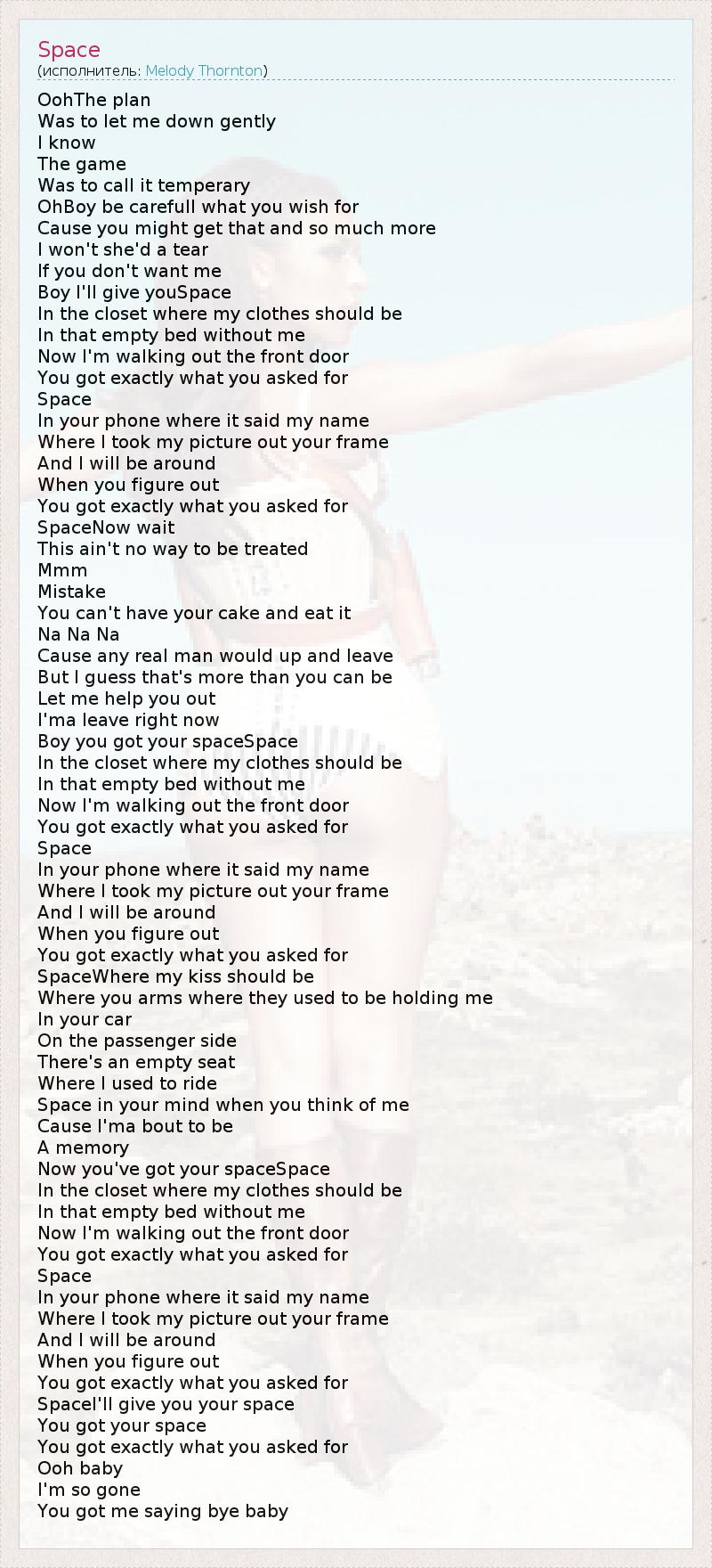 OohThe plan Was to let me down gently I know The game Was to call it temperary OhBoy be carefull what you wish for Cause you might get that and so much more I won't she'd a tear If you don't want me Boy I'll give youSpace In the closet where my clothes should be In that empty bed without me Now I'm walking out the front door You got exactly what you asked for Space In your phone where it said my name Where I took my picture out your frame And I will be around When you figure out You got exactly what you asked for SpaceNow wait This ain't no way to be treated Mmm Mistake You can't have your cake and eat it Na Na Na Cause any real man would up and leave But I guess that's more than you can be Let me help you out I'ma leave right now Boy you got your spaceSpace In the closet where my clothes should be In that empty bed without me Now I'm walking out the front door You got exactly what you asked for Space In your phone where it said my name Where I took my picture out your frame And I will be around When you figure out You got exactly what you asked for SpaceWhere my kiss should be Where you arms where they used to be holding me In your car On the passenger side There's an empty seat Where I used to ride Space in your mind when you think of me Cause I'ma bout to be A memory Now you've got your spaceSpace In the closet where my clothes should be In that empty bed without me Now I'm walking out the front door You got exactly what you asked for Space In your phone where it said my name Where I took my picture out your frame And I will be around When you figure out You got exactly what you asked for SpaceI'll give you your space You got your space You got exactly what you asked for Ooh baby I'm so gone You got me saying bye baby