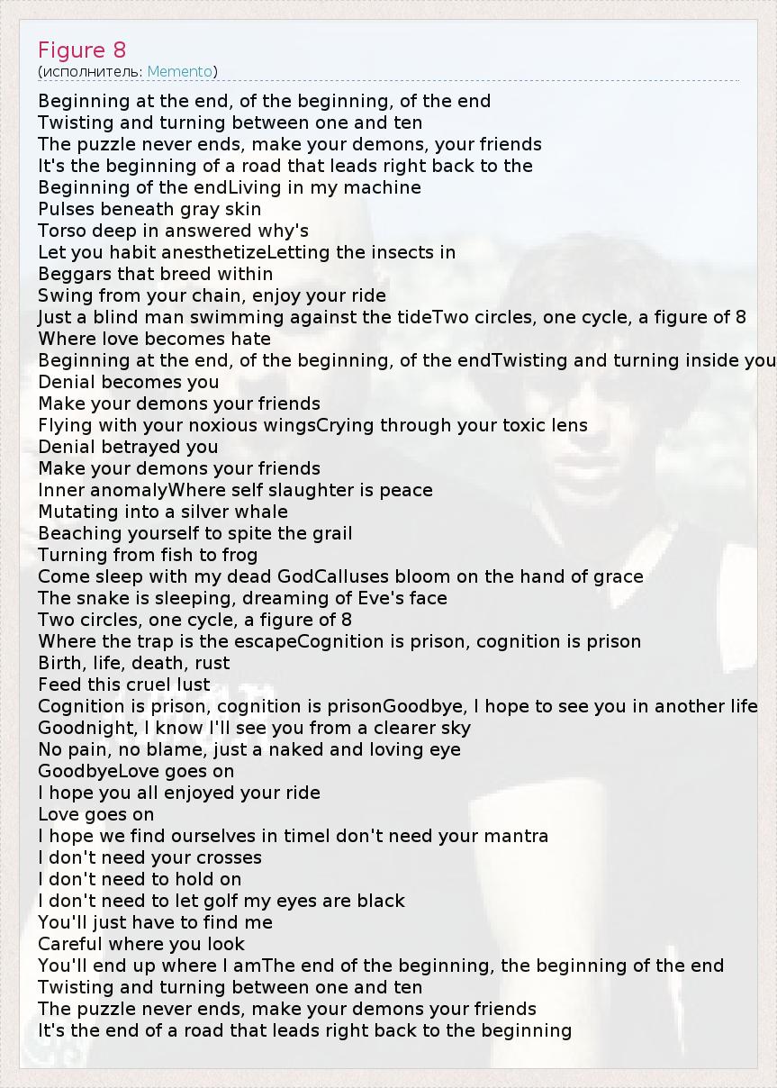 Это интересно:Группа Memento образована в 2001 году в Австралии вокалистом Джастином Стюартом Котта (Justin Stewart Cotta), гитаристом Спейсом (Space), бассистом Лайтаном Кирнсом (Leighton Kearns) и ударником Стивом Кларком (Steve Clark).Свой дебютный альбом Beginnings группа выпустила 25 февраля 2003 года. Два сингла Nothing Sacred и Savior оказались очень удачными, было снято видео на песню Coming.Летом 2003 года группа выступила на легендарном... продолжение