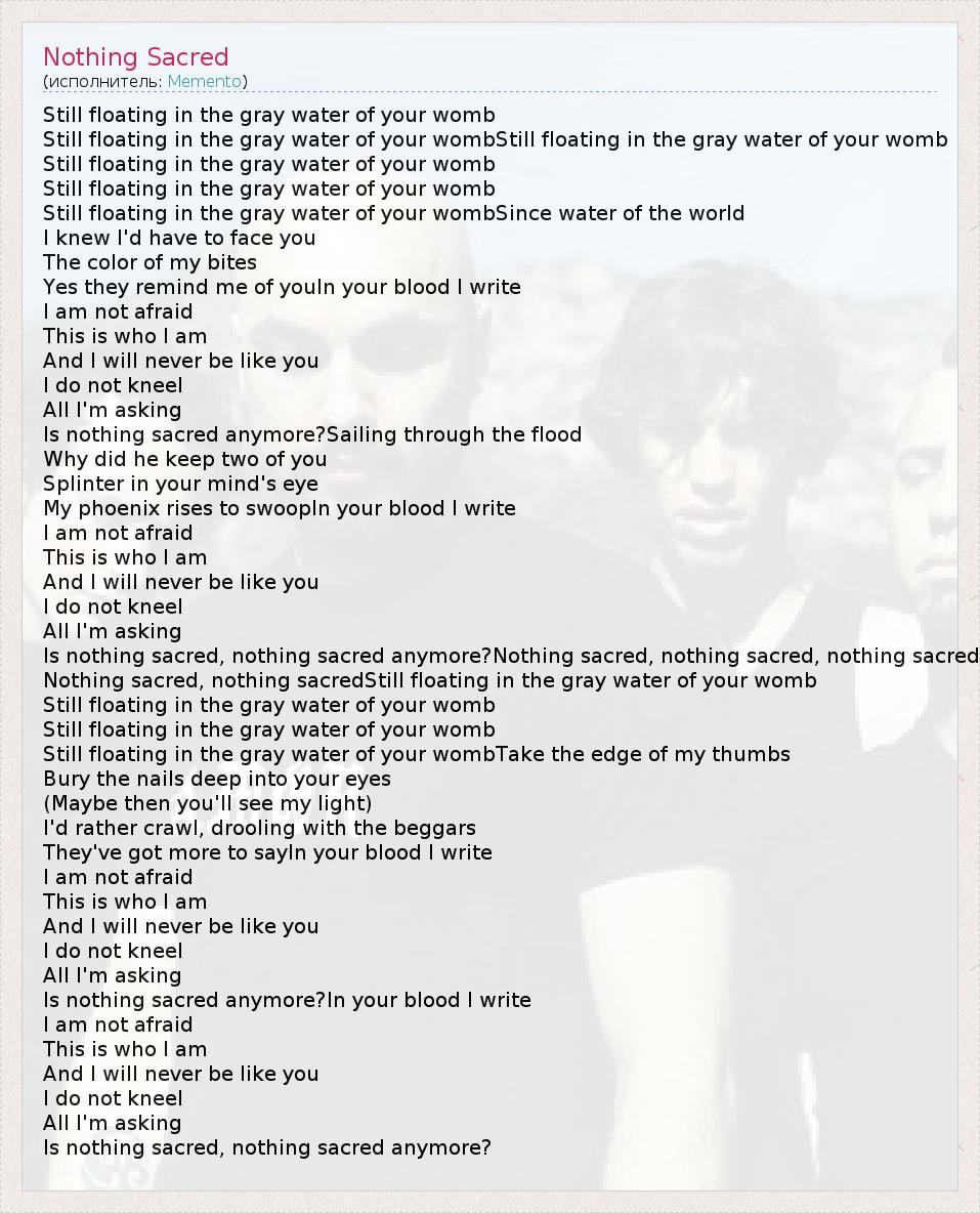 Still floating in the gray water of your womb Still floating in the gray water of your wombStill floating in the gray water of your womb Still floating in the gray water of your womb Still floating in the gray water of your womb Still floating in the gray water of your wombSince water of the world I knew I'd have to face you The color of my bites Yes they remind me of youIn your blood I write I am not afraid This is who I am And I will never be like you I do not kneel All I'm asking Is nothing sacred anymore?Sailing through the flood Why did he keep two of you Splinter in your mind's eye My phoenix rises to swoopIn your blood I write I am not afraid This is who I am And I will never be like you I do not kneel All I'm asking Is nothing sacred, nothing sacred anymore?Nothing sacred, nothing sacred, nothing sacred Nothing sacred, nothing sacredStill floating in the gray water of your womb Still floating in the gray water of your womb Still floating in the gray water of your womb Still floating in the gray water of your wombTake the edge of my thumbs Bury the nails deep into your eyes (Maybe then you'll see my light) I'd rather crawl, drooling with the beggars They've got more to sayIn your blood I write I am not afraid This is who I am And I will never be like you I do not kneel All I'm asking Is nothing sacred anymore?In your blood I write I am not afraid This is who I am And I will never be like you I do not kneel All I'm asking Is nothing sacred, nothing sacred anymore?