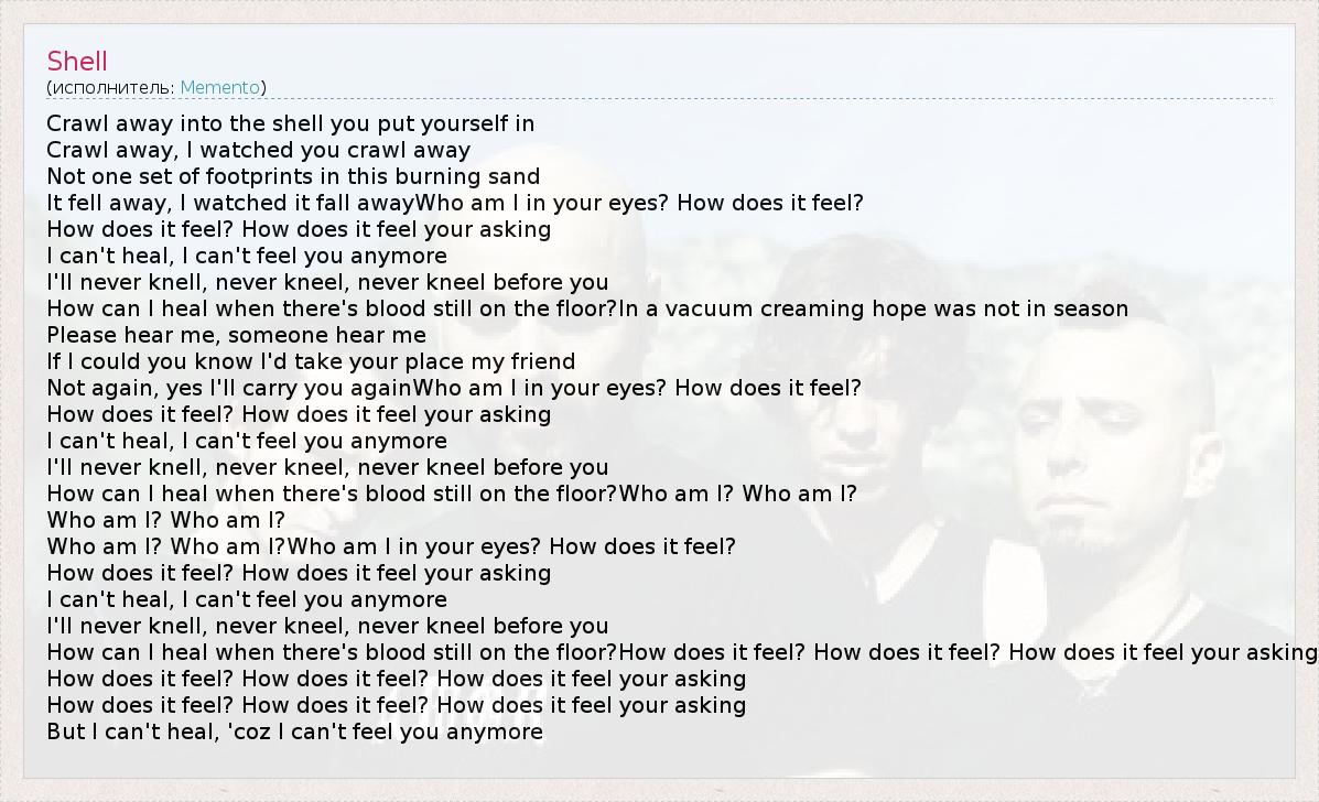 Это интересно:Группа Memento образована в 2001 году в Австралии вокалистом Джастином Стюартом Котта (Justin Stewart Cotta), гитаристом Спейсом (Space), бассистом Лайтаном Кирнсом (Leighton Kearns) и ударником Стивом Кларком (Steve Clark).Свой дебютный альбом Beginnings группа выпустила 25 февраля 2003 года. Два сингла Nothing Sacred и Savior оказались очень удачными, было снято видео на песню Coming.Летом 2003 года группа выступила на легендарном... продолжение