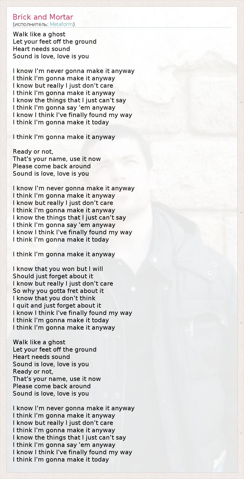 Walk like a ghost Let your feet off the ground Heart needs sound Sound is love, love is you I know I'm never gonna make it anyway I think I'm gonna make it anyway I know but really I just don't care I think I'm gonna make it anyway I know the things that I just can't say I think I'm gonna say 'em anyway I know I think I've finally found my way I think I'm gonna make it today I think I'm gonna make it anyway Ready or not, That's your name, use it now Please come back around Sound is love, love is you I know I'm never gonna make it anyway I think I'm gonna make it anyway I know but really I just don't care I think I'm gonna make it anyway I know the things that I just can't say I think I'm gonna say 'em anyway I know I think I've finally found my way I think I'm gonna make it today I think I'm gonna make it anyway I know that you won but I will Should just forget about it I know but really I just don't care So why you gotta fret about it I know that you don't think I quit and just forget about it I know I think I've finally found my way I think I'm gonna make it today I think I'm gonna make it anyway Walk like a ghost Let your feet off the ground Heart needs sound Sound is love, love is you Ready or not, That's your name, use it now Please come back around Sound is love, love is you I know I'm never gonna make it anyway I think I'm gonna make it anyway I know but really I just don't care I think I'm gonna make it anyway I know the things that I just can't say I think I'm gonna say 'em anyway I know I think I've finally found my way I think I'm gonna make it today