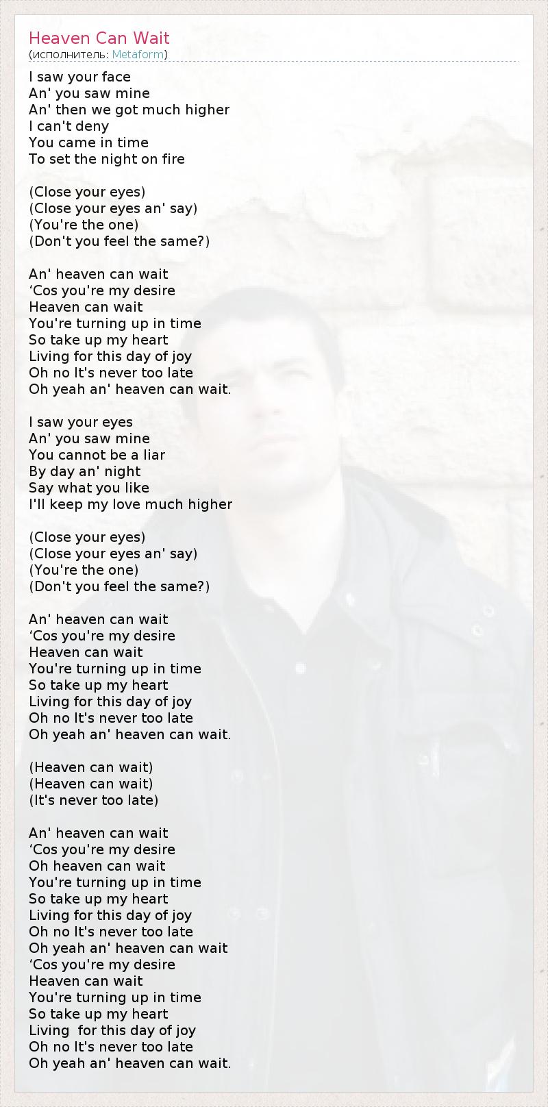 I saw your face An' you saw mine An' then we got much higher I can't deny You came in time To set the night on fire (Close your eyes) (Close your eyes an' say) (You're the one) (Don't you feel the same?) An' heaven can wait ‘Cos you're my desire Heaven can wait You're turning up in time So take up my heart Living for this day of joy Oh no It's never too late Oh yeah an' heaven can wait. I saw your eyes An' you saw mine You cannot be a liar By day an' night Say what you like I'll keep my love much higher (Close your eyes) (Close your eyes an' say) (You're the one) (Don't you feel the same?) An' heaven can wait ‘Cos you're my desire Heaven can wait You're turning up in time So take up my heart Living for this day of joy Oh no It's never too late Oh yeah an' heaven can wait. (Heaven can wait) (Heaven can wait) (It's never too late) An' heaven can wait ‘Cos you're my desire Oh heaven can wait You're turning up in time So take up my heart Living for this day of joy Oh no It's never too late Oh yeah an' heaven can wait ‘Cos you're my desire Heaven can wait You're turning up in time So take up my heart Living for this day of joy Oh no It's never too late Oh yeah an' heaven can wait.
