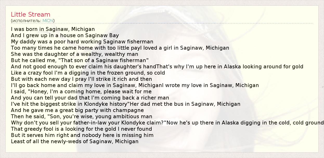Too many times he came home with too little payI loved a girl in Saginaw, Michigan