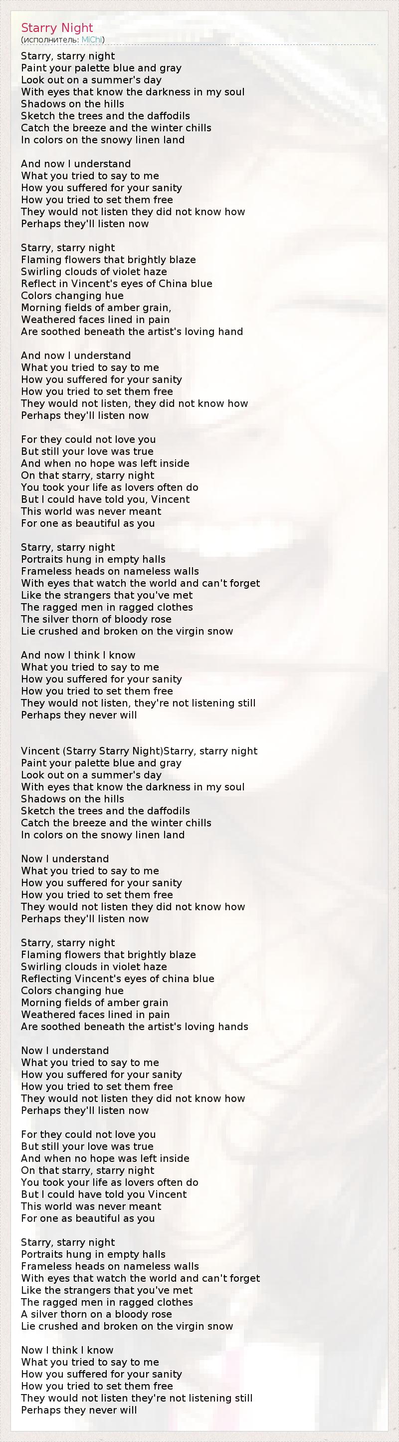 Starry, starry night Paint your palette blue and gray Look out on a summer's day With eyes that know the darkness in my soul Shadows on the hills Sketch the trees and the daffodils Catch the breeze and the winter chills In colors on the snowy linen land And now I understand What you tried to say to me How you suffered for your sanity How you tried to set them free They would not listen they did not know how Perhaps they'll listen now Starry, starry night Flaming flowers that brightly blaze Swirling clouds of violet haze Reflect in Vincent's eyes of China blue Colors changing hue Morning fields of amber grain, Weathered faces lined in pain Are soothed beneath the artist's loving hand And now I understand What you tried to say to me How you suffered for your sanity How you tried to set them free They would not listen, they did not know how Perhaps they'll listen now For they could not love you But still your love was true And when no hope was left inside On that starry, starry night You took your life as lovers often do But I could have told you, Vincent This world was never meant For one as beautiful as you Starry, starry night Portraits hung in empty halls Frameless heads on nameless walls With eyes that watch the world and can't forget Like the strangers that you've met The ragged men in ragged clothes The silver thorn of bloody rose Lie crushed and broken on the virgin snow And now I think I know What you tried to say to me How you suffered for your sanity How you tried to set them free They would not listen, they're not listening still Perhaps they never will Vincent (Starry Starry Night)Starry, starry night Paint your palette blue and gray Look out on a summer's day With eyes that know the darkness in my soul Shadows on the hills Sketch the trees and the daffodils Catch the breeze and the winter chills In colors on the snowy linen land Now I understand What you tried to say to me How you suffered for your sanity How you tried to set them free They would not listen they did not know how Perhaps they'll listen now Starry, starry night Flaming flowers that brightly blaze Swirling clouds in violet haze Reflecting Vincent's eyes of china blue Colors changing hue Morning fields of amber grain Weathered faces lined in pain Are soothed beneath the artist's loving hands Now I understand What you tried to say to me How you suffered for your sanity How you tried to set them free They would not listen they did not know how Perhaps they'll listen now For they could not love you But still your love was true And when no hope was left inside On that starry, starry night You took your life as lovers often do But I could have told you Vincent This world was never meant For one as beautiful as you Starry, starry night Portraits hung in empty halls Frameless heads on nameless walls With eyes that watch the world and can't forget Like the strangers that you've met The ragged men in ragged clothes A silver thorn on a bloody rose Lie crushed and broken on the virgin snow Now I think I know What you tried to say to me How you suffered for your sanity How you tried to set them free They would not listen they're not listening still Perhaps they never will