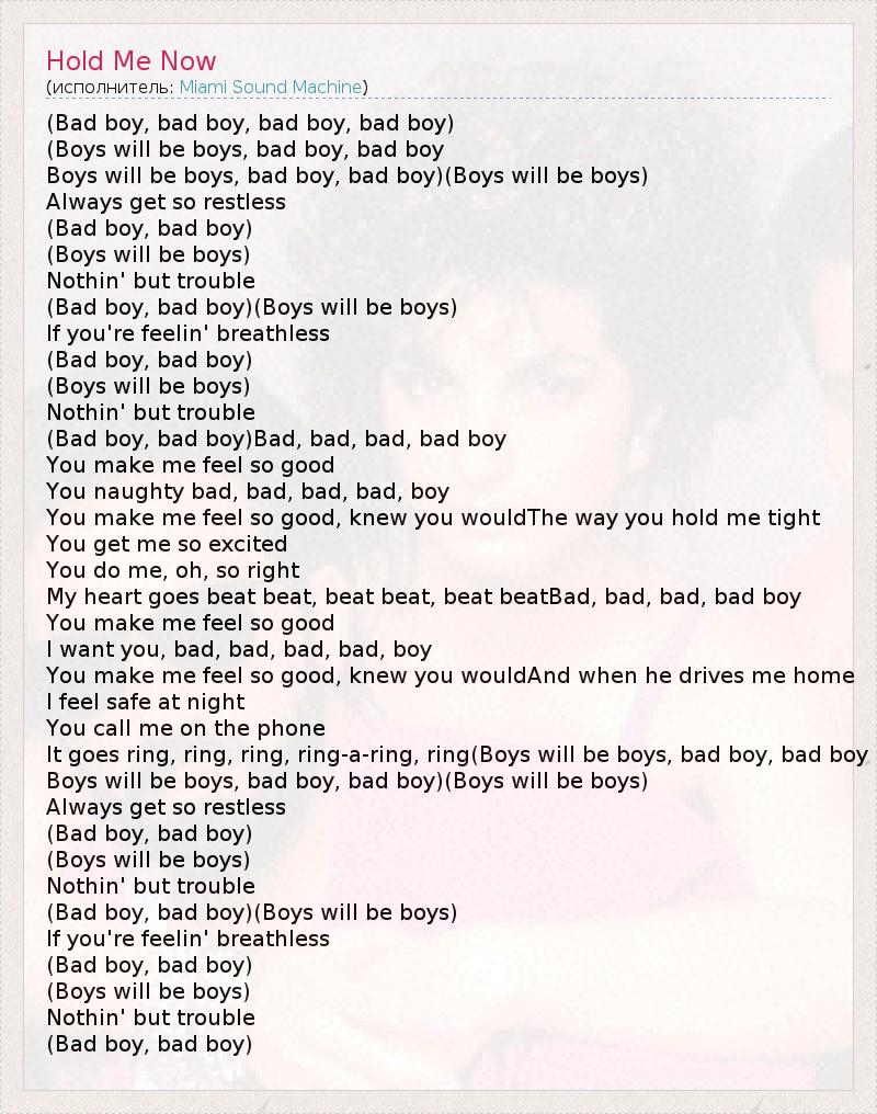 (Bad boy, bad boy, bad boy, bad boy) (Boys will be boys, bad boy, bad boy Boys will be boys, bad boy, bad boy)(Boys will be boys) Always get so restless (Bad boy, bad boy) (Boys will be boys) Nothin' but trouble (Bad boy, bad boy)(Boys will be boys) If you're feelin' breathless (Bad boy, bad boy) (Boys will be boys) Nothin' but trouble (Bad boy, bad boy)Bad, bad, bad, bad boy You make me feel so good You naughty bad, bad, bad, bad, boy You make me feel so good, knew you wouldThe way you hold me tight You get me so excited You do me, oh, so right My heart goes beat beat, beat beat, beat beatBad, bad, bad, bad boy You make me feel so good I want you, bad, bad, bad, bad, boy You make me feel so good, knew you wouldAnd when he drives me home I feel safe at night You call me on the phone It goes ring, ring, ring, ring-a-ring, ring(Boys will be boys, bad boy, bad boy Boys will be boys, bad boy, bad boy)(Boys will be boys) Always get so restless (Bad boy, bad boy) (Boys will be boys) Nothin' but trouble (Bad boy, bad boy)(Boys will be boys) If you're feelin' breathless (Bad boy, bad boy) (Boys will be boys) Nothin' but trouble (Bad boy, bad boy)
