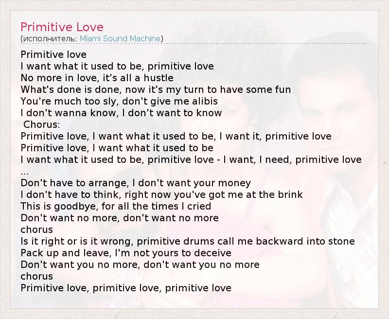Primitive love I want what it used to be, primitive love No more in love, it's all a hustle What's done is done, now it's my turn to have some fun You're much too sly, don't give me alibis I don't wanna know, I don't want to know Chorus: Primitive love, I want what it used to be, I want it, primitive love Primitive love, I want what it used to be I want what it used to be, primitive love - I want, I need, primitive love ... Don't have to arrange, I don't want your money I don't have to think, right now you've got me at the brink This is goodbye, for all the times I cried Don't want no more, don't want no more chorus Is it right or is it wrong, primitive drums call me backward into stone Pack up and leave, I'm not yours to deceive Don't want you no more, don't want you no more chorus Primitive love, primitive love, primitive love