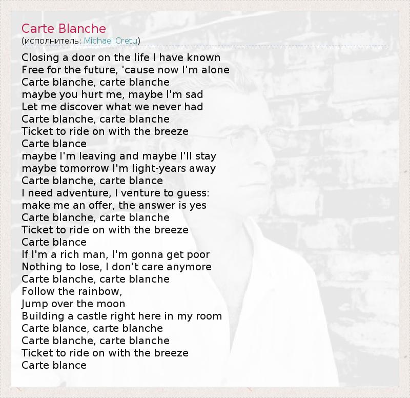 Closing a door on the life I have known Free for the future, 'cause now I'm alone Carte blanche, carte blanche maybe you hurt me, maybe I'm sad Let me discover what we never had Carte blanche, carte blanche Ticket to ride on with the breeze Carte blance maybe I'm leaving and maybe I'll stay maybe tomorrow I'm light-years away Carte blanche, carte blance I need adventure, I venture to guess: make me an offer, the answer is yes Carte blanche, carte blanche Ticket to ride on with the breeze Carte blance If I'm a rich man, I'm gonna get poor Nothing to lose, I don't care anymore Carte blanche, carte blanche Follow the rainbow, Jump over the moon Building a castle right here in my room Carte blance, carte blanche Carte blanche, carte blanche Ticket to ride on with the breeze Carte blance