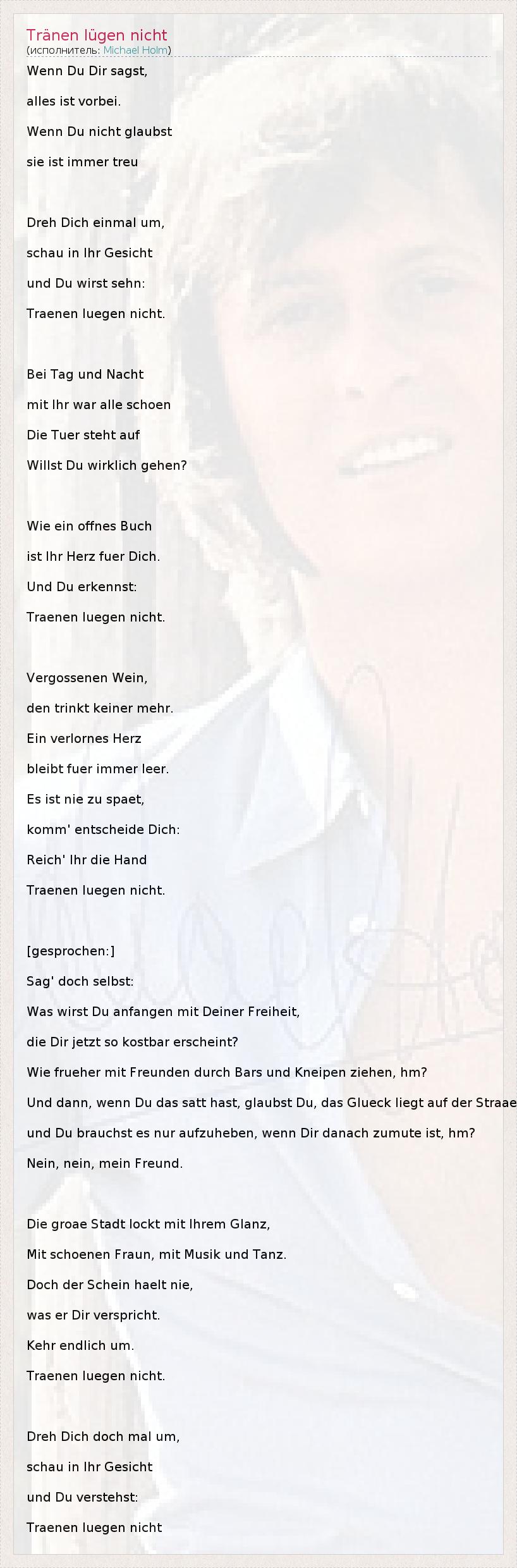Wenn Du Dir sagst, alles ist vorbei. Wenn Du nicht glaubst sie ist immer treu Dreh Dich einmal um, schau in Ihr Gesicht und Du wirst sehn: Traenen luegen nicht. Bei Tag und Nacht mit Ihr war alle schoen Die Tuer steht auf Willst Du wirklich gehen? Wie ein offnes Buch ist Ihr Herz fuer Dich. Und Du erkennst: Traenen luegen nicht. Vergossenen Wein, den trinkt keiner mehr. Ein verlornes Herz bleibt fuer immer leer. Es ist nie zu spaet, komm' entscheide Dich: Reich' Ihr die Hand Traenen luegen nicht. [gesprochen:] Sag' doch selbst: Was wirst Du anfangen mit Deiner Freiheit, die Dir jetzt so kostbar erscheint? Wie frueher mit Freunden durch Bars und Kneipen ziehen, hm? Und dann, wenn Du das satt hast, glaubst Du, das Glueck liegt auf der Straae und Du brauchst es nur aufzuheben, wenn Dir danach zumute ist, hm? Nein, nein, mein Freund. Die groae Stadt lockt mit Ihrem Glanz, Mit schoenen Fraun, mit Musik und Tanz. Doch der Schein haelt nie, was er Dir verspricht. Kehr endlich um. Traenen luegen nicht. Dreh Dich doch mal um, schau in Ihr Gesicht und Du verstehst: Traenen luegen nicht
