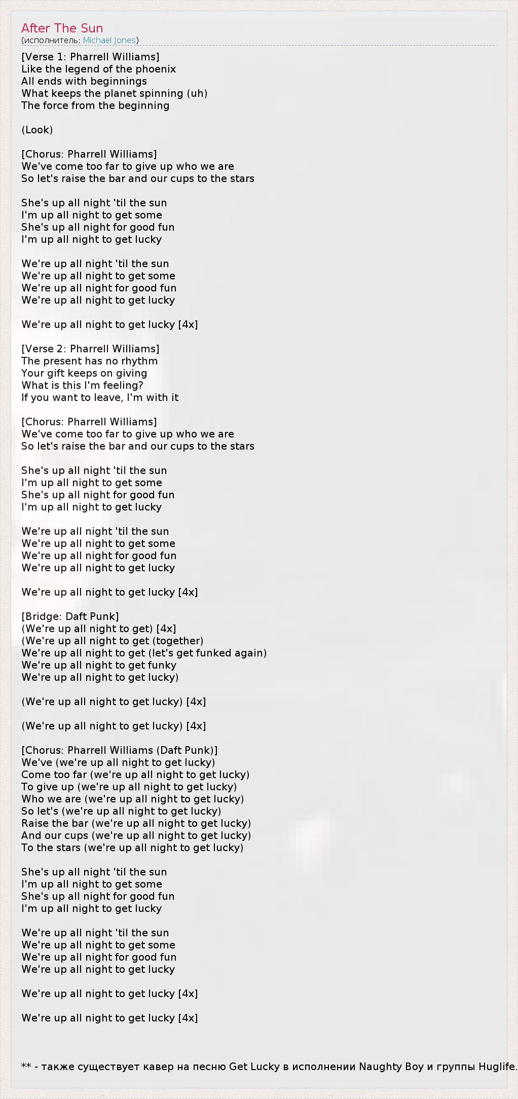 ** - также существует кавер на песню Get Lucky в исполнении Naughty Boy и группы Huglife.