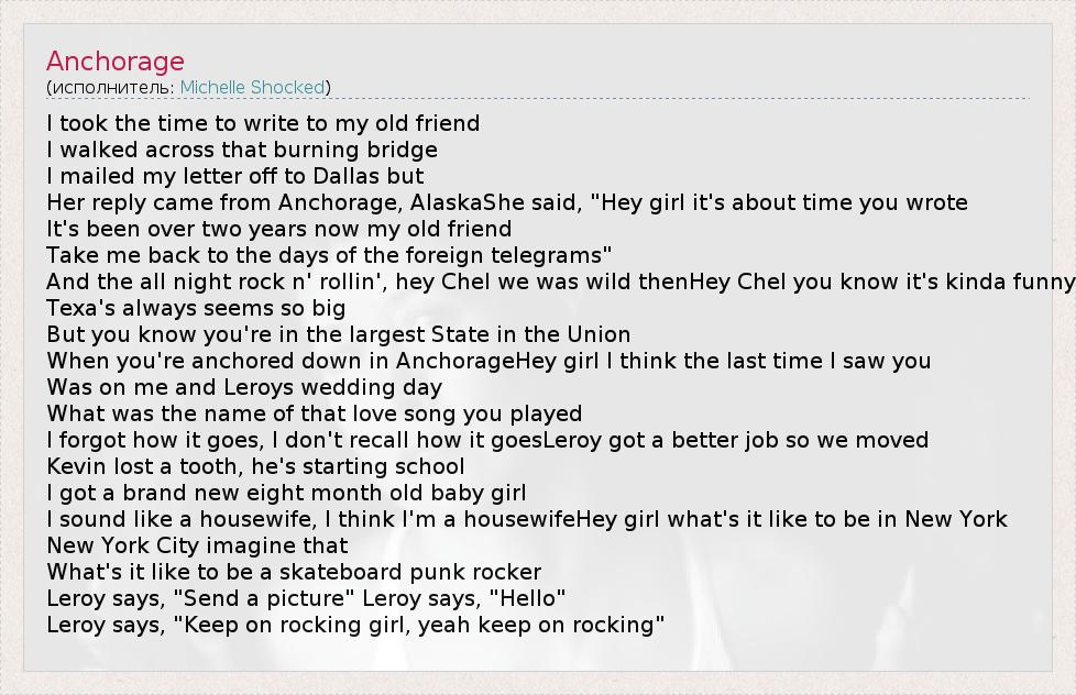 I took the time to write to my old friend I walked across that burning bridge I mailed my letter off to Dallas but Her reply came from Anchorage, AlaskaShe said, "Hey girl it's about time you wrote It's been over two years now my old friend Take me back to the days of the foreign telegrams" And the all night rock n' rollin', hey Chel we was wild thenHey Chel you know it's kinda funny Texa's always seems so big But you know you're in the largest State in the Union When you're anchored down in AnchorageHey girl I think the last time I saw you Was on me and Leroys wedding day What was the name of that love song you played I forgot how it goes, I don't recall how it goesLeroy got a better job so we moved Kevin lost a tooth, he's starting school I got a brand new eight month old baby girl I sound like a housewife, I think I'm a housewifeHey girl what's it like to be in New York New York City imagine that What's it like to be a skateboard punk rocker Leroy says, "Send a picture" Leroy says, "Hello" Leroy says, "Keep on rocking girl, yeah keep on rocking"