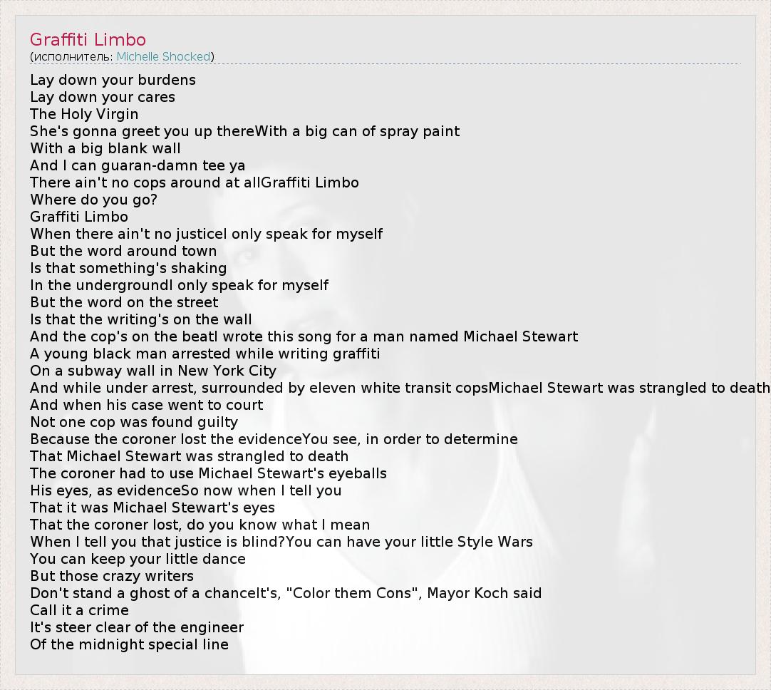 Lay down your burdens Lay down your cares The Holy Virgin She's gonna greet you up thereWith a big can of spray paint With a big blank wall And I can guaran-damn tee ya There ain't no cops around at allGraffiti Limbo Where do you go? Graffiti Limbo When there ain't no justiceI only speak for myself But the word around town Is that something's shaking In the undergroundI only speak for myself But the word on the street Is that the writing's on the wall And the cop's on the beatI wrote this song for a man named Michael Stewart A young black man arrested while writing graffiti On a subway wall in New York City And while under arrest, surrounded by eleven white transit copsMichael Stewart was strangled to death And when his case went to court Not one cop was found guilty Because the coroner lost the evidenceYou see, in order to determine That Michael Stewart was strangled to death The coroner had to use Michael Stewart's eyeballs His eyes, as evidenceSo now when I tell you That it was Michael Stewart's eyes That the coroner lost, do you know what I mean When I tell you that justice is blind?You can have your little Style Wars You can keep your little dance But those crazy writers Don't stand a ghost of a chanceIt's, "Color them Cons", Mayor Koch said Call it a crime It's steer clear of the engineer Of the midnight special line