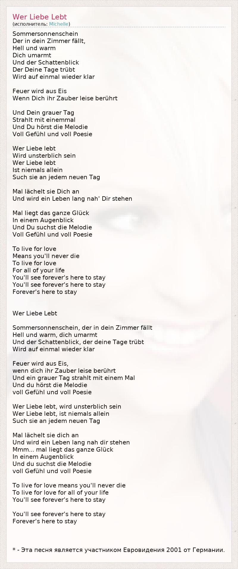 Sommersonnenschein Der in dein Zimmer fällt, Hell und warm Dich umarmt Und der Schattenblick Der Deine Tage trübt Wird auf einmal wieder klar Feuer wird aus Eis Wenn Dich ihr Zauber leise berührt Und Dein grauer Tag Strahlt mit einemmal Und Du hörst die Melodie Voll Gefühl und voll Poesie Wer Liebe lebt Wird unsterblich sein Wer Liebe lebt Ist niemals allein Such sie an jedem neuen Tag Mal lächelt sie Dich an Und wird ein Leben lang nah' Dir stehen Mal liegt das ganze Glück In einem Augenblick Und Du suchst die Melodie Voll Gefühl und voll Poesie To live for love Means you'll never die To live for love For all of your life You'll see forever's here to stay You'll see forever's here to stay Forever's here to stay Wer Liebe Lebt Sommersonnenschein, der in dein Zimmer fällt Hell und warm, dich umarmt Und der Schattenblick, der deine Tage trübt Wird auf einmal wieder klar Feuer wird aus Eis, wenn dich ihr Zauber leise berührt Und ein grauer Tag strahlt mit einem Mal Und du hörst die Melodie voll Gefühl und voll Poesie Wer Liebe lebt, wird unsterblich sein Wer Liebe lebt, ist niemals allein Such sie an jedem neuen Tag Mal lächelt sie dich an Und wird ein Leben lang nah dir stehen Mmm... mal liegt das ganze Glück In einem Augenblick Und du suchst die Melodie voll Gefühl und voll Poesie To live for love means you'll never die To live for love for all of your life You'll see forever's here to stay You'll see forever's here to stay Forever's here to stay * - Эта песня является участником Евровидения 2001 от Германии.