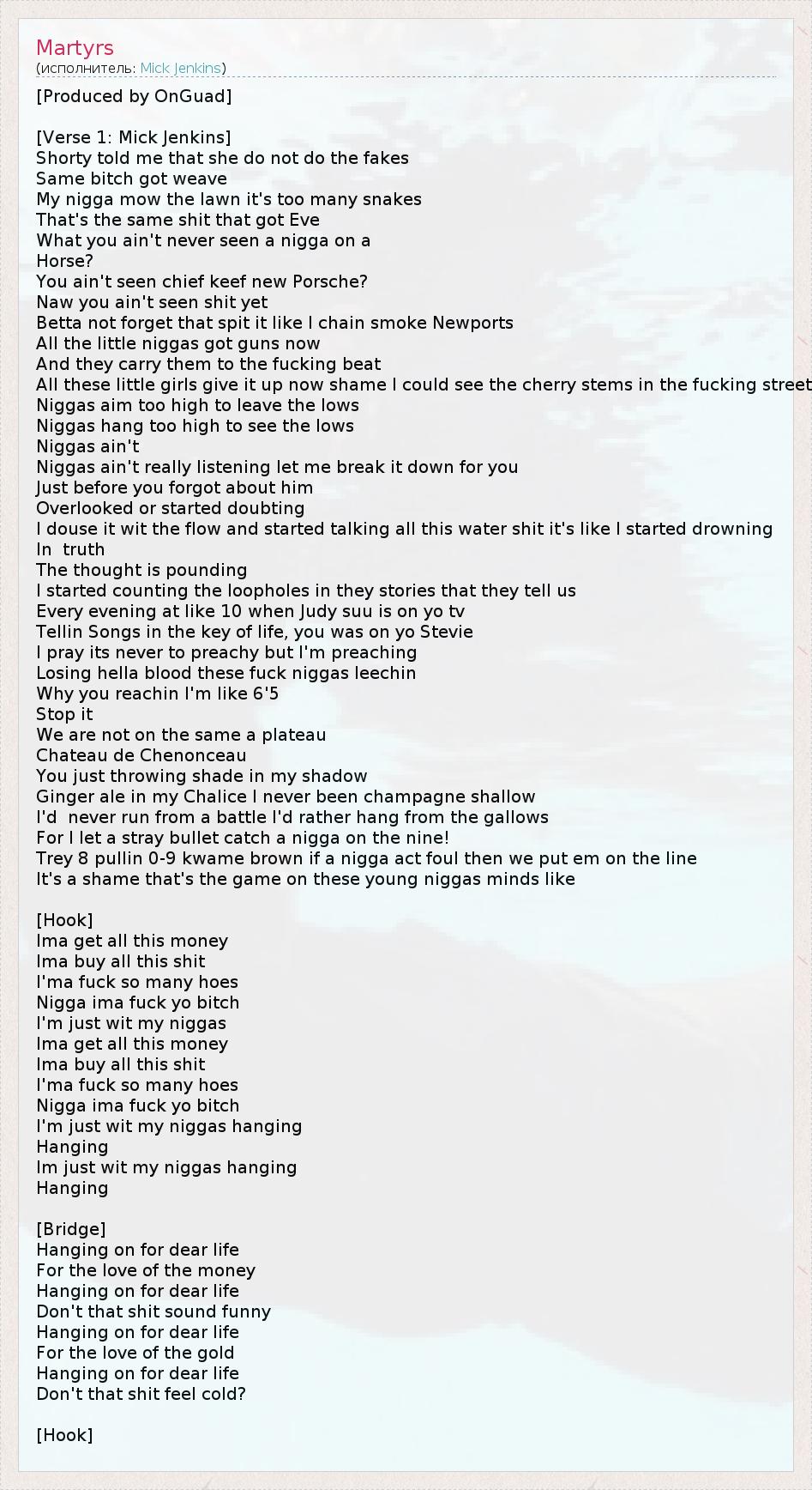 [Produced by OnGuad] [Verse 1: Mick Jenkins] Shorty told me that she do not do the fakes Same bitch got weave My nigga mow the lawn it's too many snakes That's the same shit that got Eve What you ain't never seen a nigga on a Horse? You ain't seen chief keef new Porsche? Naw you ain't seen shit yet Betta not forget that spit it like I chain smoke Newports All the little niggas got guns now And they carry them to the fucking beat All these little girls give it up now shame I could see the cherry stems in the fucking street Niggas aim too high to leave the lows Niggas hang too high to see the lows Niggas ain't Niggas ain't really listening let me break it down for you Just before you forgot about him Overlooked or started doubting I douse it wit the flow and started talking all this water shit it's like I started drowning In truth The thought is pounding I started counting the loopholes in they stories that they tell us Every evening at like 10 when Judy suu is on yo tv Tellin Songs in the key of life, you was on yo Stevie I pray its never to preachy but I'm preaching Losing hella blood these fuck niggas leechin Why you reachin I'm like 6'5 Stop it We are not on the same a plateau Chateau de Chenonceau You just throwing shade in my shadow Ginger ale in my Chalice I never been champagne shallow I'd never run from a battle I'd rather hang from the gallows For I let a stray bullet catch a nigga on the nine! Trey 8 pullin 0-9 kwame brown if a nigga act foul then we put em on the line It's a shame that's the game on these young niggas minds like [Hook] Ima get all this money Ima buy all this shit I'ma fuck so many hoes Nigga ima fuck yo bitch I'm just wit my niggas Ima get all this money Ima buy all this shit I'ma fuck so many hoes Nigga ima fuck yo bitch I'm just wit my niggas hanging Hanging Im just wit my niggas hanging Hanging [Bridge] Hanging on for dear life For the love of the money Hanging on for dear life Don't that shit sound funny Hanging on for dear life For the love of the gold Hanging on for dear life Don't that shit feel cold? [Hook]
