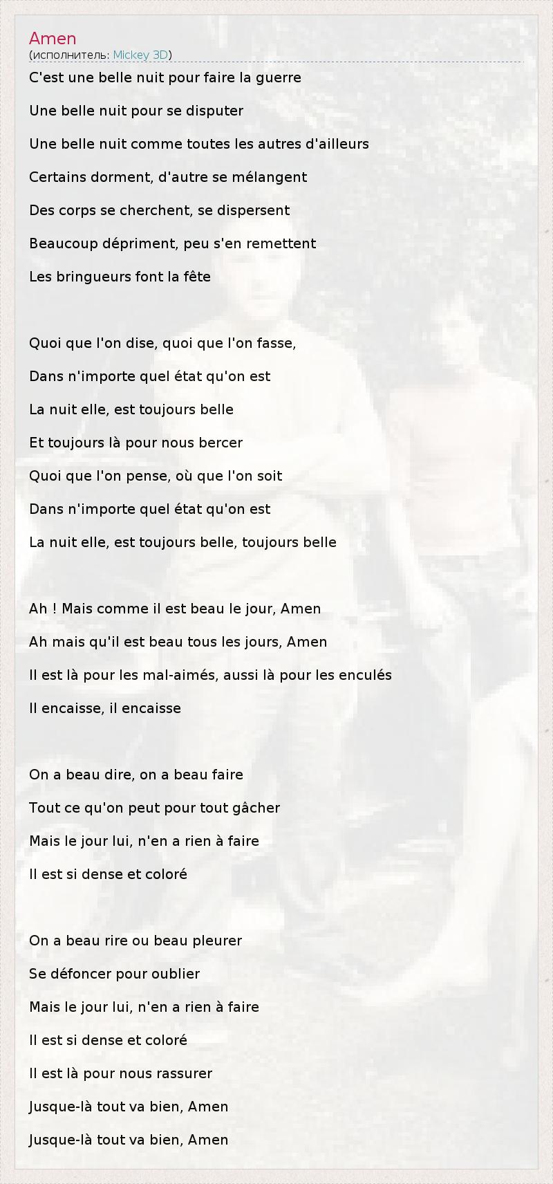 C'est une belle nuit pour faire la guerre Une belle nuit pour se disputer Une belle nuit comme toutes les autres d'ailleurs Certains dorment, d'autre se mélangent Des corps se cherchent, se dispersent Beaucoup dépriment, peu s'en remettent Les bringueurs font la fête Quoi que l'on dise, quoi que l'on fasse, Dans n'importe quel état qu'on est La nuit elle, est toujours belle Et toujours là pour nous bercer Quoi que l'on pense, où que l'on soit Dans n'importe quel état qu'on est La nuit elle, est toujours belle, toujours belle Ah ! Mais comme il est beau le jour, Amen Ah mais qu'il est beau tous les jours, Amen Il est là pour les mal-aimés, aussi là pour les enculés Il encaisse, il encaisse On a beau dire, on a beau faire Tout ce qu'on peut pour tout gâcher Mais le jour lui, n'en a rien à faire Il est si dense et coloré On a beau rire ou beau pleurer Se défoncer pour oublier Mais le jour lui, n'en a rien à faire Il est si dense et coloré Il est là pour nous rassurer Jusque-là tout va bien, Amen Jusque-là tout va bien, Amen