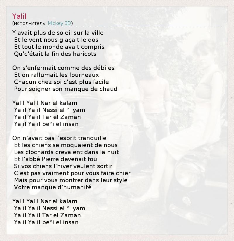 Y avait plus de soleil sur la ville Et le vent nous glaçait le dos Et tout le monde avait compris Qu'c'était la fin des haricots On s'enfermait comme des débiles Et on rallumait les fourneaux Chacun chez soi c'est plus facile Pour soigner son manque de chaud Yalil Yalil Nar el kalam Yalil Yalil Nessi el ° Iyam Yalil Yalil Tar el Zaman Yalil Yalil be°i el insan On n'avait pas l'esprit tranquille Et les chiens se moquaient de nous Les clochards crevaient dans la nuit Et l'abbé Pierre devenait fou Si vos chiens l'hiver veulent sortir C'est pas vraiment pour vous faire chier Mais pour vous montrer dans leur style Votre manque d'humanité Yalil Yalil Nar el kalam Yalil Yalil Nessi el ° Iyam Yalil Yalil Tar el Zaman Yalil Yalil be°i el insan