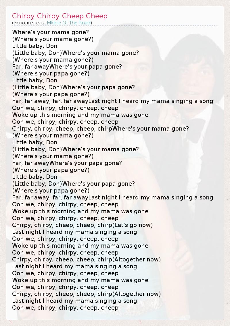 Where's your mama gone? (Where's your mama gone?) Little baby, Don (Little baby, Don)Where's your mama gone? (Where's your mama gone?) Far, far awayWhere's your papa gone? (Where's your papa gone?) Little baby, Don (Little baby, Don)Where's your papa gone? (Where's your papa gone?) Far, far away, far, far awayLast night I heard my mama singing a song Ooh we, chirpy, chirpy, cheep, cheep Woke up this morning and my mama was gone Ooh we, chirpy, chirpy, cheep, cheep Chirpy, chirpy, cheep, cheep, chirpWhere's your mama gone? (Where's your mama gone?) Little baby, Don (Little baby, Don)Where's your mama gone? (Where's your mama gone?) Far, far awayWhere's your papa gone? (Where's your papa gone?) Little baby, Don (Little baby, Don)Where's your papa gone? (Where's your papa gone?) Far, far away, far, far awayLast night I heard my mama singing a song Ooh we, chirpy, chirpy, cheep, cheep Woke up this morning and my mama was gone Ooh we, chirpy, chirpy, cheep, cheep Chirpy, chirpy, cheep, cheep, chirp(Let's go now) Last night I heard my mama singing a song Ooh we, chirpy, chirpy, cheep, cheep Woke up this morning and my mama was gone Ooh we, chirpy, chirpy, cheep, cheep Chirpy, chirpy, cheep, cheep, chirp(Altogether now) Last night I heard my mama singing a song Ooh we, chirpy, chirpy, cheep, cheep Woke up this morning and my mama was gone Ooh we, chirpy, chirpy, cheep, cheep Chirpy, chirpy, cheep, cheep, chirp(Altogether now) Last night I heard my mama singing a song Ooh we, chirpy, chirpy, cheep, cheep