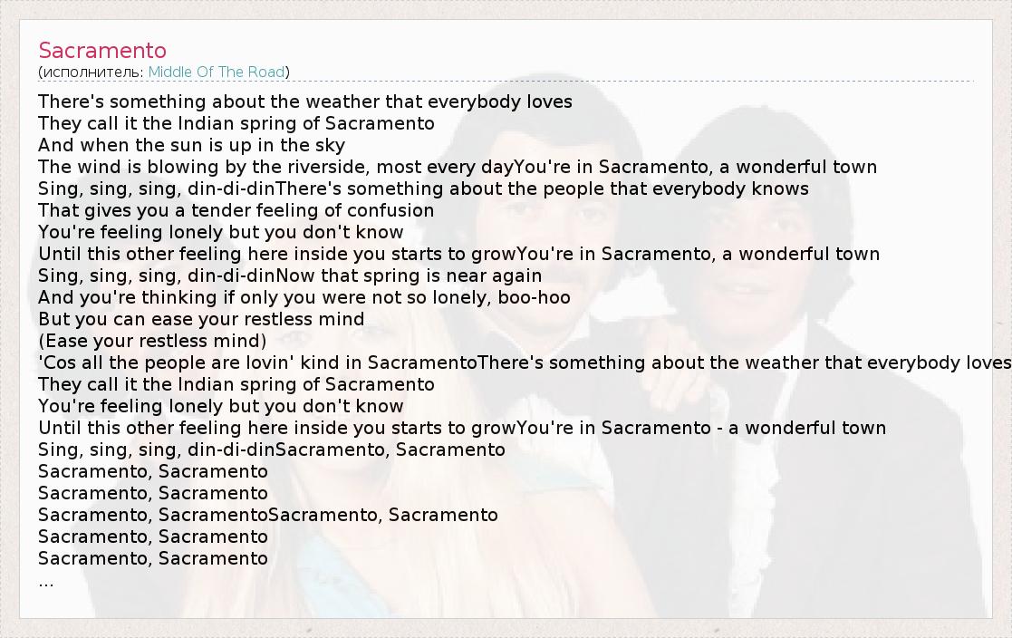 There's something about the weather that everybody loves They call it the Indian spring of Sacramento And when the sun is up in the sky The wind is blowing by the riverside, most every dayYou're in Sacramento, a wonderful town Sing, sing, sing, din-di-dinThere's something about the people that everybody knows That gives you a tender feeling of confusion You're feeling lonely but you don't know Until this other feeling here inside you starts to growYou're in Sacramento, a wonderful town Sing, sing, sing, din-di-dinNow that spring is near again And you're thinking if only you were not so lonely, boo-hoo But you can ease your restless mind (Ease your restless mind) 'Cos all the people are lovin' kind in SacramentoThere's something about the weather that everybody loves They call it the Indian spring of Sacramento You're feeling lonely but you don't know Until this other feeling here inside you starts to growYou're in Sacramento - a wonderful town Sing, sing, sing, din-di-dinSacramento, Sacramento Sacramento, Sacramento Sacramento, Sacramento Sacramento, SacramentoSacramento, Sacramento Sacramento, Sacramento Sacramento, Sacramento ...