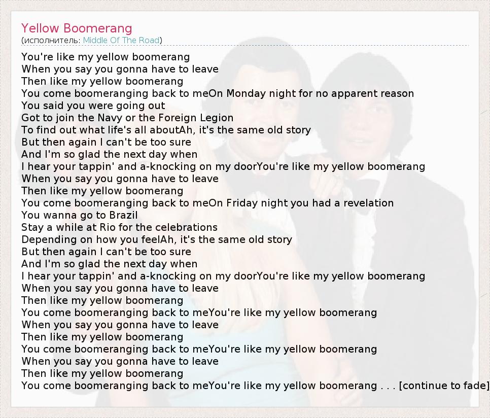 You're like my yellow boomerang When you say you gonna have to leave Then like my yellow boomerang You come boomeranging back to meOn Monday night for no apparent reason You said you were going out Got to join the Navy or the Foreign Legion To find out what life's all aboutAh, it's the same old story But then again I can't be too sure And I'm so glad the next day when I hear your tappin' and a-knocking on my doorYou're like my yellow boomerang When you say you gonna have to leave Then like my yellow boomerang You come boomeranging back to meOn Friday night you had a revelation You wanna go to Brazil Stay a while at Rio for the celebrations Depending on how you feelAh, it's the same old story But then again I can't be too sure And I'm so glad the next day when I hear your tappin' and a-knocking on my doorYou're like my yellow boomerang When you say you gonna have to leave Then like my yellow boomerang You come boomeranging back to meYou're like my yellow boomerang When you say you gonna have to leave Then like my yellow boomerang You come boomeranging back to meYou're like my yellow boomerang When you say you gonna have to leave Then like my yellow boomerang You come boomeranging back to meYou're like my yellow boomerang . . . [continue to fade]