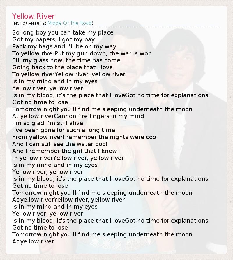 So long boy you can take my place Got my papers, I got my pay Pack my bags and I'll be on my way To yellow riverPut my gun down, the war is won Fill my glass now, the time has come Going back to the place that I love To yellow riverYellow river, yellow river Is in my mind and in my eyes Yellow river, yellow river Is in my blood, it's the place that I loveGot no time for explanations Got no time to lose Tomorrow night you'll find me sleeping underneath the moon At yellow riverCannon fire lingers in my mind I'm so glad I'm still alive I've been gone for such a long time From yellow riverI remember the nights were cool And I can still see the water pool And I remember the girl that I knew In yellow riverYellow river, yellow river Is in my mind and in my eyes Yellow river, yellow river Is in my blood, it's the place that I loveGot no time for explanations Got no time to lose Tomorrow night you'll find me sleeping underneath the moon At yellow riverYellow river, yellow river Is in my mind and in my eyes Yellow river, yellow river Is in my blood, it's the place that I loveGot no time for explanations Got no time to lose Tomorrow night you'll find me sleeping underneath the moon At yellow river