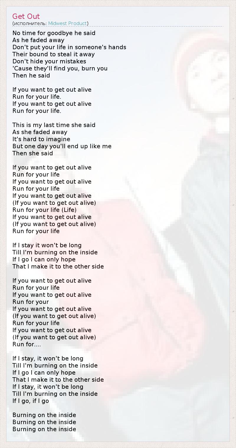 No time for goodbye he said As he faded away Don't put your life in someone's hands Their bound to steal it away Don't hide your mistakes 'Cause they'll find you, burn you Then he said If you want to get out alive Run for your life. If you want to get out alive Run for your life. This is my last time she said As she faded away It's hard to imagine But one day you'll end up like me Then she said If you want to get out alive Run for your life If you want to get out alive Run for your life If you want to get out alive (If you want to get out alive) Run for your life (Life) If you want to get out alive (If you want to get out alive) Run for your life If I stay it won't be long Till I'm burning on the inside If I go I can only hope That I make it to the other side If you want to get out alive Run for your life If you want to get out alive Run for your If you want to get out alive (If you want to get out alive) Run for your life If you want to get out alive (If you want to get out alive) Run for.... If I stay, it won't be long Till I'm burning on the inside If I go I can only hope That I make it to the other side If I stay, it won't be long Till I'm burning on the inside If I go, if I go Burning on the inside Burning on the inside Burning on the inside