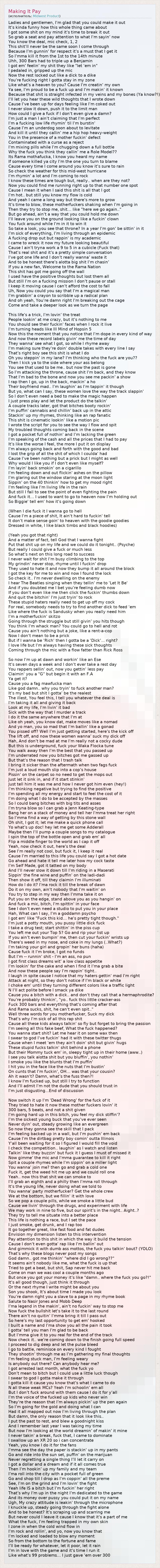 Ladies and gentlemen, I'm glad that you could make it out It's kinda funny how this whole thing came about I got some shit on my mind it's time to break it out So grab a seat and pay attention to what I'm sayin’ now You know the deal, mic check, 1, 2 This shit'll never be the same soon I come through Because I’m gunnin' for respect it's a must that I get it So I'mma kill it from the 1st to the 14th minute Uhh, 300 Bars had to triple up a Benjamin I got em’ feelin’ my shit they like "let 'em in" I pedaled in, gripped up the mic Now the rest locked out like a dick to a dike You're fucking right I gotta stay in my zone Like what's a heaven to you? Cause I'm creatin' my own Ya see, I'm proud to be a fuck up and I'm makin' it known Because that shit is straight infected in my veins and my bones (Ya know?!) I'll let you hear these wild thoughts that I wrote down Cause I've been up for days feeling like I'm coked out I never slow it down, push it to the limit man How could I give a fuck if I don't even give a damn? I'm just a man I ain't claiming that I'm perfect I'm a fucking low life rhymin' til I'm burstin' Cause I'm an underdog soon about to levitate And kill it until they callin' me a hip hop heavy-weight You in the presence of a mother fuckin' defect Contaminated with a curse as a reject I'm mixing pills while I'm chugging down a full bottle Why the fuck you think they callin’ me a Role Model?? Its Rama mothafucka, I know you heard my name If someone killed ya city I'm the one you turn to blame Cause every time I come around you know it's sure to rain So check the weather for this mid-west hurricane I'm rhymin' a lot and I'm coming to rock I know these times are tough but, really.. when are they not? Now you could find me running right up to that number one spot Cause I mean it when I said this shit is all that I got I'm hot.. but still you know my flow is cold And yeah I came a long way but there’s more to grow It’s time to blow, these motherfuckers shaking when I'm going in Then they try to stop me, shit… like "here we go again.." But go ahead, ain't a way that you could hold me down I'll leave you on the ground looking like a fuckin' clown You fuck around while I'm in it to win it So take a look, you see that throne? In a year I'm gon' be sittin' in it I’m sick of everything, I’m living through an epidemic A fucking drop out but rappin' is my academic I came to wreck it now my future looking beautiful Cause I ain't tryna work a 9 to 5 in a cubicle (Fuck that) That's real shit and it’s a pretty simple conversation I've got one life and I don’t really wanna’ waste it And to be honest there’s alotta big shit I'm chasin’ If you a new fan, Welcome to the Rama Nation This shit has got me going off the wall I used have the positive thoughts but lost them all But still I'm on a fucking mission I don’t pause or stall I keep it moving cause I can't afford the cost to fall Uh, Now you could you say that I'm a magical man I'm grabbin’ a crayon to scribble up a radical plan And oh yeah, You're damn right I'm breaking out the cage Come and take a deeper look as we turn the page This life's a trick, I'm lovin’ the treat People lookin’ at me crazy, but it's nothing to me You should see their fuckin' faces when I rock it live I'm turning heads like Ill Mind of Hopsin 5 Now this the moment that you notice that I'm dope in every kind of way And now these record labels givin' me the time of day They wanna’ see what I got, so while I rhyme away I'm making sure they're doin' double takes with every line I say That’s right boy see this shit is what I do Oh you steppin' in my lane? I'm thinking who the fuck are you?? Then I kick ya to the side where your ass belong You see that used to be me.. but now the past is gone So I'm attacking the throne, cause shit I'm back, and they know That I'm bad to the bone and now you see me packin’ a show I rap then I go, up in the back, mackin' a ho Their boyfriend mad.. I'm laughin’ as I'm tappin' it though But yo, what can I say, these women love the way the track slappin' So I don’t even need a bed to make the magic happen I just press play and let the product do the talkin' A couple tracks later, got that bitches booty rockin' I'm puffin' cannabis and chillin’ back up in the attic Stackin' up my rhymes, thinking like an rap fanatic This shit is cinematic lookin' like a motion pic I wrote the script for you to see the way I flow and spit My troubled thoughts coming back in the scene I got a pocket full of nothin' and I'm lacking the green I'm speaking of the cash and all the prices that I had to pay It’s like the worse I feel, the more I put it on display I'm always going back and forth with the good and bad I lost the grip of all the shit of which I coulda' had Cause I've been nothing but a prick but I might as well Why would I like you if I don't even like myself? I'm layin' back smokin' on a cigarillo I'm feeling down and out flickin' ashes on the pillow I'm glaring out the window staring at the moon light Sippin' on the 40 thinkin' how to get my mood right I'm feeling like I'm living life in the rain But still I fail to see the point of even fighting the pain And fuck it… I used to want to go to heaven now I'm holding out So Biggie' tell em' how it's going down (When I die fuck it I wanna go to hell Cause I'm a piece of shit, It ain't hard to fuckin' tell It don't make sense goin' to heaven with the goodie goodies Dressed in white, I like black timbs and black hoodies) (Yeah you got that right) And a matter of fact, tell God that I wanna fight Put that shit up on my life and we could do it tonight.. (Psyche) But really I could give a fuck or much less So what’s next on this long road to success I never wait for shit I'm busy climbing to the top My grindin' never stop, rhyme until I fuckin’ drop They used to hate it and now they bump it all around the block I got the key for me to win and now I found the lock So