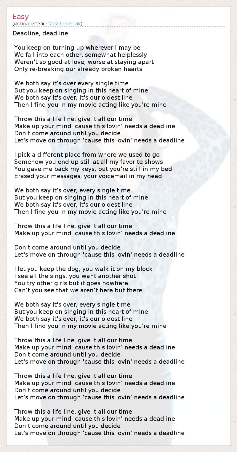 Deadline, deadline You keep on turning up wherever I may be We fall into each other, somewhat helplessly Weren't so good at love, worse at staying apart Only re-breaking our already broken hearts We both say it's over every single time But you keep on singing in this heart of mine We both say it's over, it's our oldest line Then I find you in my movie acting like you're mine Throw this a life line, give it all our time Make up your mind 'cause this lovin' needs a deadline Don't come around until you decide Let's move on through 'cause this lovin' needs a deadline I pick a different place from where we used to go Somehow you end up still at all my favorite shows You gave me back my keys, but you're still in my bed Erased your messages, your voicemail in my head We both say it's over, every single time But you keep on singing in this heart of mine We both say it's over, it's our oldest line Then I find you in my movie acting like you're mine Throw this a life line, give it all our time Make up your mind 'cause this lovin' needs a deadline Don't come around until you decide Let's move on through 'cause this lovin' needs a deadline I let you keep the dog, you walk it on my block I see all the sings, you want another shot You try other girls but it goes nowhere Can't you see that we aren't here but there We both say it's over, every single time But you keep on singing in this heart of mine We both say it's over, it's our oldest line Then I find you in my movie acting like you're mine Throw this a life line, give it all our time Make up your mind 'cause this lovin' needs a deadline Don't come around until you decide Let's move on through 'cause this lovin' needs a deadline Throw this a life line, give it all our time Make up your mind 'cause this lovin' needs a deadline Don't come around until you decide Let's move on through 'cause this lovin' needs a deadline Throw this a life line, give it all our time Make up your mind 'cause this lovin' needs a deadline Don't come around until you decide Let's move on through 'cause this lovin' needs a deadline
