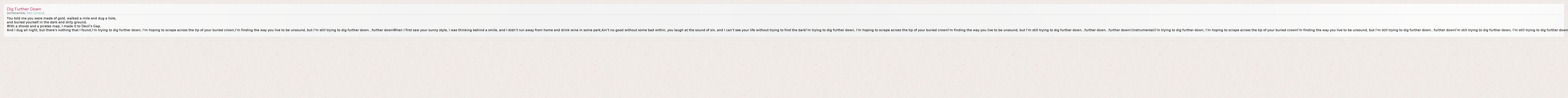 And I dug all night, but there's nothing that I found,I'm trying to dig further down, I'm hoping to scrape across the tip of your buried crown,I'm finding the way you live to be unsound, but I'm still trying to dig further down...further downWhen I first saw your sunny style, I was thinking behind a smile, and I didn't run away from home and drink wine in some park,Ain't no good without some bad within, you laugh at the sound of sin, and I can't see your life without trying to find the darkI'm trying to dig further down, I'm hoping to scrape across the tip of your buried crownI'm finding the way you live to be unsound, but I'm still trying to dig further down...further down...further down!(Instrumental)I'm trying to dig further down, I'm hoping to scrape across the tip of your buried crownI'm finding the way you live to be unsound, but I'm still trying to dig further down...further downI'm still trying to dig further down, I'm still trying to dig further down