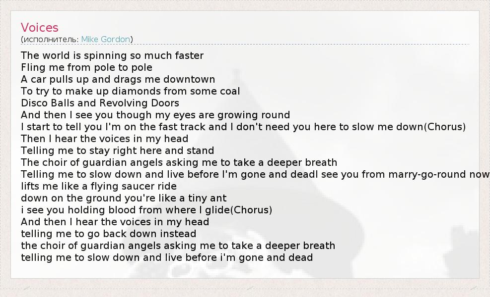 The world is spinning so much faster Fling me from pole to pole A car pulls up and drags me downtown To try to make up diamonds from some coal Disco Balls and Revolving Doors And then I see you though my eyes are growing round I start to tell you I'm on the fast track and I don't need you here to slow me down(Chorus) Then I hear the voices in my head Telling me to stay right here and stand The choir of guardian angels asking me to take a deeper breath Telling me to slow down and live before I'm gone and deadI see you from marry-go-round now lifts me like a flying saucer ride down on the ground you're like a tiny ant i see you holding blood from where I glide(Chorus) And then I hear the voices in my head telling me to go back down instead the choir of guardian angels asking me to take a deeper breath telling me to slow down and live before i'm gone and dead