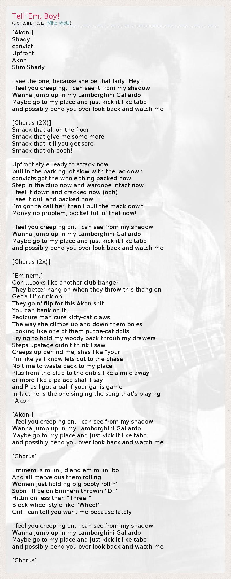 [Akon:] Shady convict Upfront Akon Slim Shady I see the one, because she be that lady! Hey! I feel you creeping, I can see it from my shadow Wanna jump up in my Lamborghini Gallardo Maybe go to my place and just kick it like tabo and possibly bend you over look back and watch me [Chorus (2X)] Smack that all on the floor Smack that give me some more Smack that 'till you get sore Smack that oh-oooh! Upfront style ready to attack now pull in the parking lot slow with the lac down convicts got the whole thing packed now Step in the club now and wardobe intact now! I feel it down and cracked now (ooh) I see it dull and backed now I'm gonna call her, than I pull the mack down Money no problem, pocket full of that now! I feel you creeping on, I can see from my shadow Wanna jump up in my Lamborghini Gallardo Maybe go to my place and just kick it like tabo and possibly bend you over look back and watch me [Chorus (2x)] [Eminem:] Ooh...Looks like another club banger They better hang on when they throw this thang on Get a lil' drink on They goin' flip for this Akon shit You can bank on it! Pedicure manicure kitty-cat claws The way she climbs up and down them poles Looking like one of them puttie-cat dolls Trying to hold my woody back throuh my drawers Steps upstage didn't think I saw Creeps up behind me, shes like "your" I'm like ya I know lets cut to the chase No time to waste back to my place Plus from the club to the crib's like a mile away or more like a palace shall I say and Plus I got a pal if your gal is game In fact he is the one singing the song that's playing "Akon!" [Akon:] I feel you creeping on, I can see from my shadow Wanna jump up in my Lamborghini Gallardo Maybe go to my place and just kick it like tabo and possibly bend you over look back and watch me [Chorus] Eminem is rollin', d and em rollin' bo And all marvelous them rolling Women just holding big booty rollin' Soon I'll be on Eminem throwin "D!" Hittin on less than "Three!" Block wheel style like "Whee!" Girl I can tell you want me because lately I feel you creeping on, I can see from my shadow Wanna jump up in my Lamborghini Gallardo Maybe go to my place and just kick it like tabo and possibly bend you over look back and watch me [Chorus]