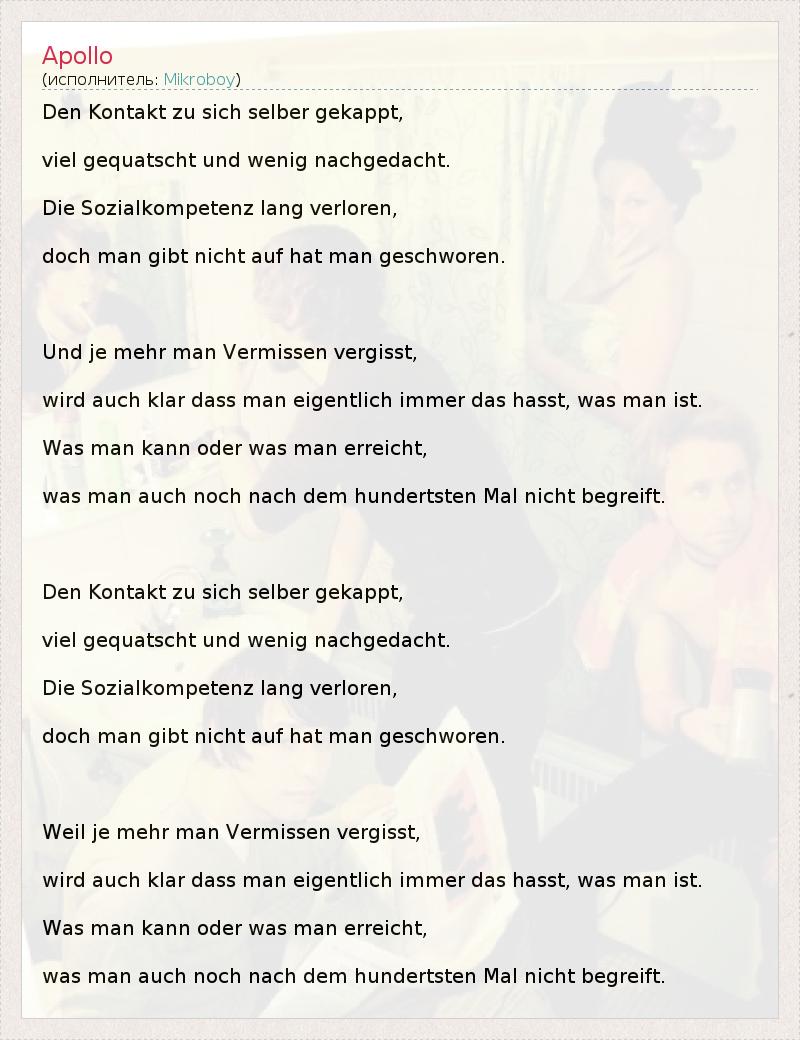Den Kontakt zu sich selber gekappt, viel gequatscht und wenig nachgedacht. Die Sozialkompetenz lang verloren, doch man gibt nicht auf hat man geschworen. Und je mehr man Vermissen vergisst, wird auch klar dass man eigentlich immer das hasst, was man ist. Was man kann oder was man erreicht, was man auch noch nach dem hundertsten Mal nicht begreift. Den Kontakt zu sich selber gekappt, viel gequatscht und wenig nachgedacht. Die Sozialkompetenz lang verloren, doch man gibt nicht auf hat man geschworen. Weil je mehr man Vermissen vergisst, wird auch klar dass man eigentlich immer das hasst, was man ist. Was man kann oder was man erreicht, was man auch noch nach dem hundertsten Mal nicht begreift.