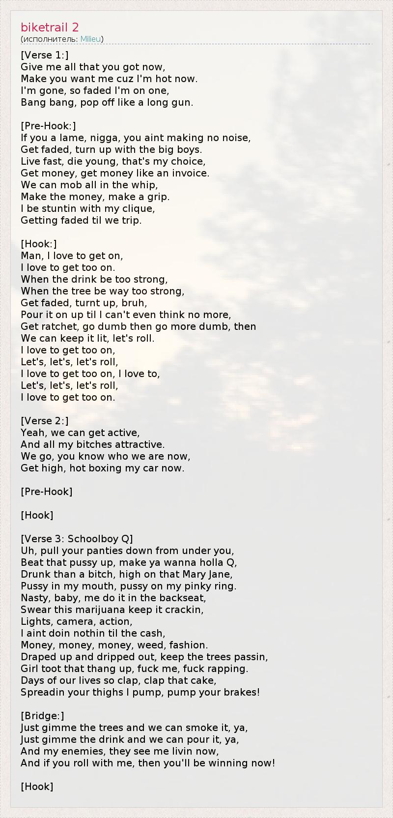 [Verse 1:] Give me all that you got now, Make you want me cuz I'm hot now. I'm gone, so faded I'm on one, Bang bang, pop off like a long gun. [Pre-Hook:] If you a lame, nigga, you aint making no noise, Get faded, turn up with the big boys. Live fast, die young, that's my choice, Get money, get money like an invoice. We can mob all in the whip, Make the money, make a grip. I be stuntin with my clique, Getting faded til we trip. [Hook:] Man, I love to get on, I love to get too on. When the drink be too strong, When the tree be way too strong, Get faded, turnt up, bruh, Pour it on up til I can't even think no more, Get ratchet, go dumb then go more dumb, then We can keep it lit, let's roll. I love to get too on, Let's, let's, let's roll, I love to get too on, I love to, Let's, let's, let's roll, I love to get too on. [Verse 2:] Yeah, we can get active, And all my bitches attractive. We go, you know who we are now, Get high, hot boxing my car now. [Pre-Hook] [Hook] [Verse 3: Schoolboy Q] Uh, pull your panties down from under you, Beat that pussy up, make ya wanna holla Q, Drunk than a bitch, high on that Mary Jane, Pussy in my mouth, pussy on my pinky ring. Nasty, baby, me do it in the backseat, Swear this marijuana keep it crackin, Lights, camera, action, I aint doin nothin til the cash, Money, money, money, weed, fashion. Draped up and dripped out, keep the trees passin, Girl toot that thang up, fuck me, fuck rapping. Days of our lives so clap, clap that cake, Spreadin your thighs I pump, pump your brakes! [Bridge:] Just gimme the trees and we can smoke it, ya, Just gimme the drink and we can pour it, ya, And my enemies, they see me livin now, And if you roll with me, then you'll be winning now! [Hook]