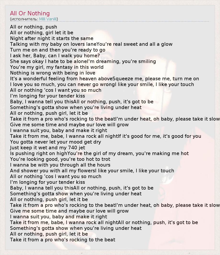 All or nothing, push All or nothing, girl let it be Night after night it starts the same Talking with my baby on lovers laneYou're real sweet and all a glow Turn me on and then you're ready to go I ask her, Baby, can I walk you home? She says okay I hate to be aloneI'm dreaming, you're smiling You're my girl, my fantasy in this world Nothing is wrong with being in love It's a wonderful feeling from heaven aboveSqueeze me, please me, turn me on I love you so much, you can never go wrongI like your smile, I like your touch All or nothing 'cos I want you so much I'm longing for your tender kiss Baby, I wanna tell you thisAll or nothing, push, it's got to be Something's gotta show when you're living under heat All or nothing, push girl, let it be Take it from a pro who's rocking to the beatI'm under heat, oh baby, please take it slow Give me some time and maybe our love will grow I wanna suit you, baby and make it right Take it from me, babe, I wanna rock all nightIf it's good for me, it's good for you You gotta never let your mood get dry Just keep it wet and my 740 jet Is pushing right on highYou're the girl of my dream, you're making me hot You're looking good, you're too hot to trot I wanna be with you through all the hours And shower you with all my flowersI like your smile, I like your touch All or nothing 'cos I want you so much I'm longing for your tender kiss Baby, I wanna tell you thisAll or nothing, push, it's got to be Something's gotta show when you're living under heat All or nothing, push girl, let it be Take it from a pro who's rocking to the beatI'm under heat, oh baby, please take it slow Give me some time and maybe our love will grow I wanna suit you, baby and make it right Take it from me, babe, I wanna rock all nightAll or nothing, push, it's got to be Something's gotta show when you're living under heat All or nothing, push girl, let it be Take it from a pro who's rocking to the beat