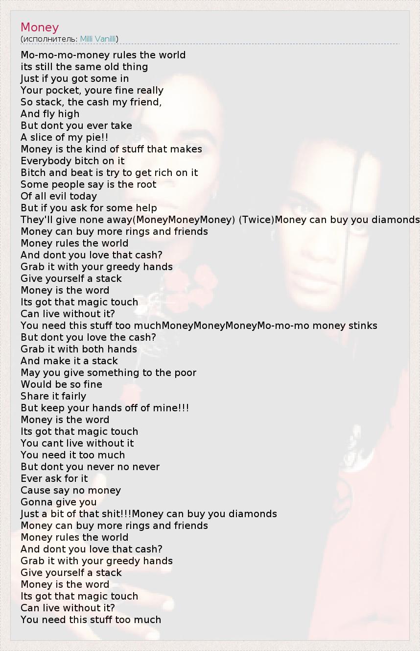 Mo-mo-mo-money rules the world its still the same old thing Just if you got some in Your pocket, youre fine really So stack, the cash my friend, And fly high But dont you ever take A slice of my pie!! Money is the kind of stuff that makes Everybody bitch on it Bitch and beat is try to get rich on it Some people say is the root Of all evil today But if you ask for some help They'll give none away(MoneyMoneyMoney) (Twice)Money can buy you diamonds Money can buy more rings and friends Money rules the world And dont you love that cash? Grab it with your greedy hands Give yourself a stack Money is the word Its got that magic touch Can live without it? You need this stuff too muchMoneyMoneyMoneyMo-mo-mo money stinks But dont you love the cash? Grab it with both hands And make it a stack May you give something to the poor Would be so fine Share it fairly But keep your hands off of mine!!! Money is the word Its got that magic touch You cant live without it You need it too much But dont you never no never Ever ask for it Cause say no money Gonna give you Just a bit of that shit!!!Money can buy you diamonds Money can buy more rings and friends Money rules the world And dont you love that cash? Grab it with your greedy hands Give yourself a stack Money is the word Its got that magic touch Can live without it? You need this stuff too much