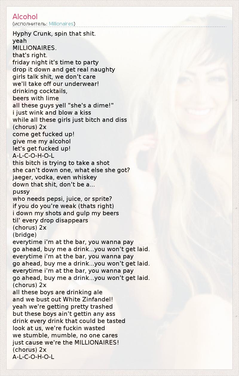 Hyphy Crunk, spin that shit. yeah MILLIONAIRES. that's right. friday night it's time to party drop it down and get real naughty girls talk shit, we don't care we'll take off our underwear! drinking cocktails, beers with lime all these guys yell "she's a dime!" i just wink and blow a kiss while all these girls just bitch and diss (chorus) 2x come get fucked up! give me my alcohol let's get fucked up! A-L-C-O-H-O-L this bitch is trying to take a shot she can't down one, what else she got? jaeger, vodka, even whiskey down that shit, don't be a... pussy who needs pepsi, juice, or sprite? if you do you're weak (thats right) i down my shots and gulp my beers til' every drop disappears (chorus) 2x (bridge) everytime i'm at the bar, you wanna pay go ahead, buy me a drink...you won't get laid. everytime i'm at the bar, you wanna pay go ahead, buy me a drink...you won't get laid. everytime i'm at the bar, you wanna pay go ahead, buy me a drink...you won't get laid. (chorus) 2x all these boys are drinking ale and we bust out White Zinfandel! yeah we're getting pretty trashed but these boys ain't gettin any ass drink every drink that could be tasted look at us, we're fuckin wasted we stumble, mumble, no one cares just cause we're the MILLIONAIRES! (chorus) 2x A-L-C-O-H-O-L