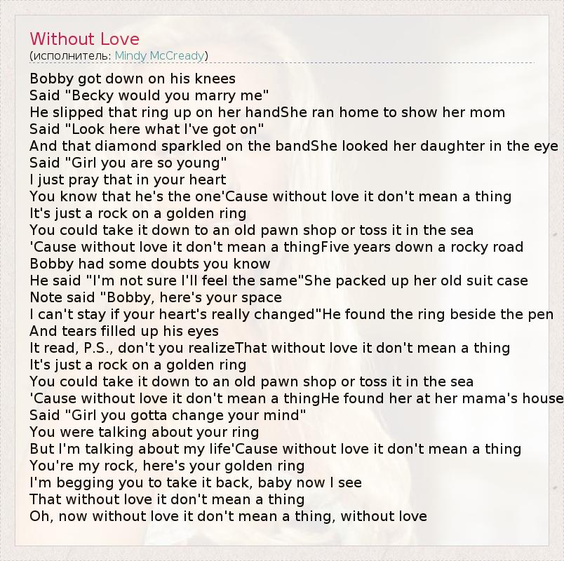 'Cause without love it don't mean a thingHe found her at her mama's house