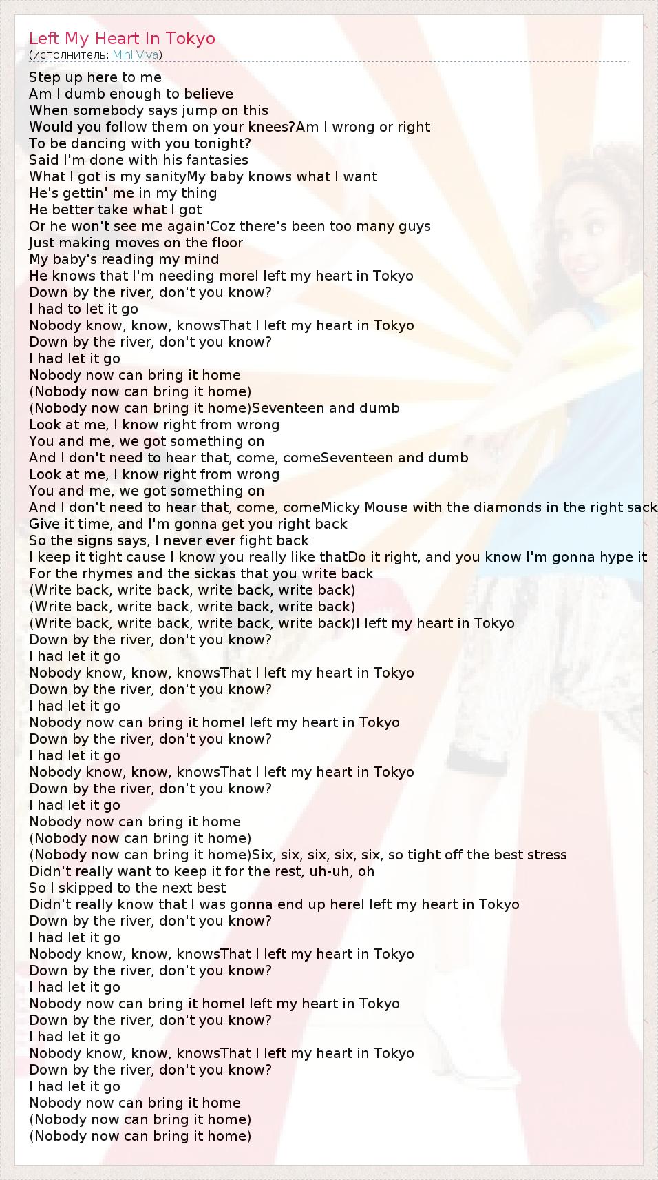 Step up here to me Am I dumb enough to believe When somebody says jump on this Would you follow them on your knees?Am I wrong or right To be dancing with you tonight? Said I'm done with his fantasies What I got is my sanityMy baby knows what I want He's gettin' me in my thing He better take what I got Or he won't see me again'Coz there's been too many guys Just making moves on the floor My baby's reading my mind He knows that I'm needing moreI left my heart in Tokyo Down by the river, don't you know? I had to let it go Nobody know, know, knowsThat I left my heart in Tokyo Down by the river, don't you know? I had let it go Nobody now can bring it home (Nobody now can bring it home) (Nobody now can bring it home)Seventeen and dumb Look at me, I know right from wrong You and me, we got something on And I don't need to hear that, come, comeSeventeen and dumb Look at me, I know right from wrong You and me, we got something on And I don't need to hear that, come, comeMicky Mouse with the diamonds in the right sack Give it time, and I'm gonna get you right back So the signs says, I never ever fight back I keep it tight cause I know you really like thatDo it right, and you know I'm gonna hype it For the rhymes and the sickas that you write back (Write back, write back, write back, write back) (Write back, write back, write back, write back) (Write back, write back, write back, write back)I left my heart in Tokyo Down by the river, don't you know? I had let it go Nobody know, know, knowsThat I left my heart in Tokyo Down by the river, don't you know? I had let it go Nobody now can bring it homeI left my heart in Tokyo Down by the river, don't you know? I had let it go Nobody know, know, knowsThat I left my heart in Tokyo Down by the river, don't you know? I had let it go Nobody now can bring it home (Nobody now can bring it home) (Nobody now can bring it home)Six, six, six, six, six, so tight off the best stress Didn't really want to keep it for the rest, uh-uh, oh So I skipped to the next best Didn't really know that I was gonna end up hereI left my heart in Tokyo Down by the river, don't you know? I had let it go Nobody know, know, knowsThat I left my heart in Tokyo Down by the river, don't you know? I had let it go Nobody now can bring it homeI left my heart in Tokyo Down by the river, don't you know? I had let it go Nobody know, know, knowsThat I left my heart in Tokyo Down by the river, don't you know? I had let it go Nobody now can bring it home (Nobody now can bring it home) (Nobody now can bring it home)