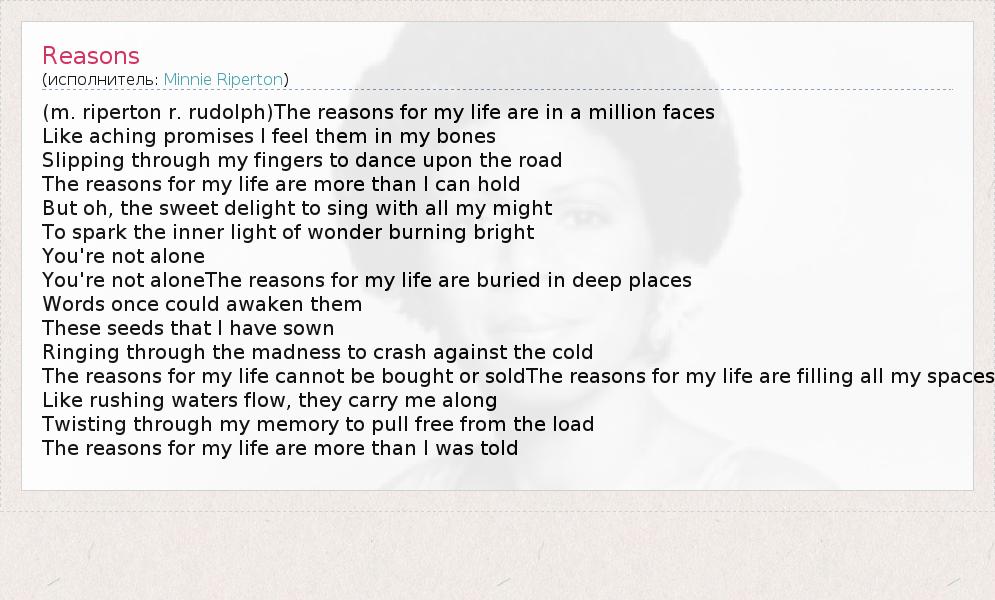(m. riperton r. rudolph)The reasons for my life are in a million faces