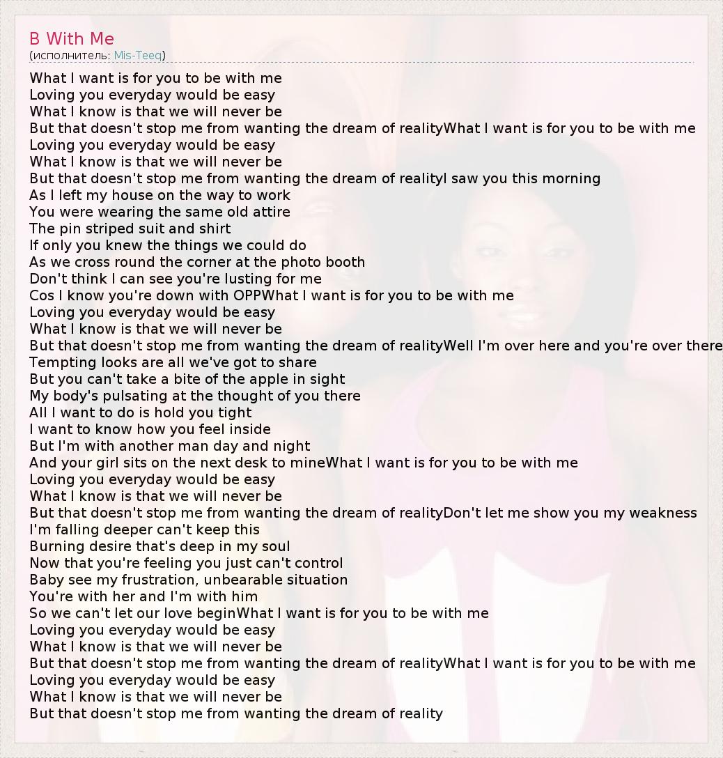 What I want is for you to be with me Loving you everyday would be easy What I know is that we will never be But that doesn't stop me from wanting the dream of realityWhat I want is for you to be with me Loving you everyday would be easy What I know is that we will never be But that doesn't stop me from wanting the dream of realityI saw you this morning As I left my house on the way to work You were wearing the same old attire The pin striped suit and shirt If only you knew the things we could do As we cross round the corner at the photo booth Don't think I can see you're lusting for me Cos I know you're down with OPPWhat I want is for you to be with me Loving you everyday would be easy What I know is that we will never be But that doesn't stop me from wanting the dream of realityWell I'm over here and you're over there Tempting looks are all we've got to share But you can't take a bite of the apple in sight My body's pulsating at the thought of you there All I want to do is hold you tight I want to know how you feel inside But I'm with another man day and night And your girl sits on the next desk to mineWhat I want is for you to be with me Loving you everyday would be easy What I know is that we will never be But that doesn't stop me from wanting the dream of realityDon't let me show you my weakness I'm falling deeper can't keep this Burning desire that's deep in my soul Now that you're feeling you just can't control Baby see my frustration, unbearable situation You're with her and I'm with him So we can't let our love beginWhat I want is for you to be with me Loving you everyday would be easy What I know is that we will never be But that doesn't stop me from wanting the dream of realityWhat I want is for you to be with me Loving you everyday would be easy What I know is that we will never be But that doesn't stop me from wanting the dream of reality