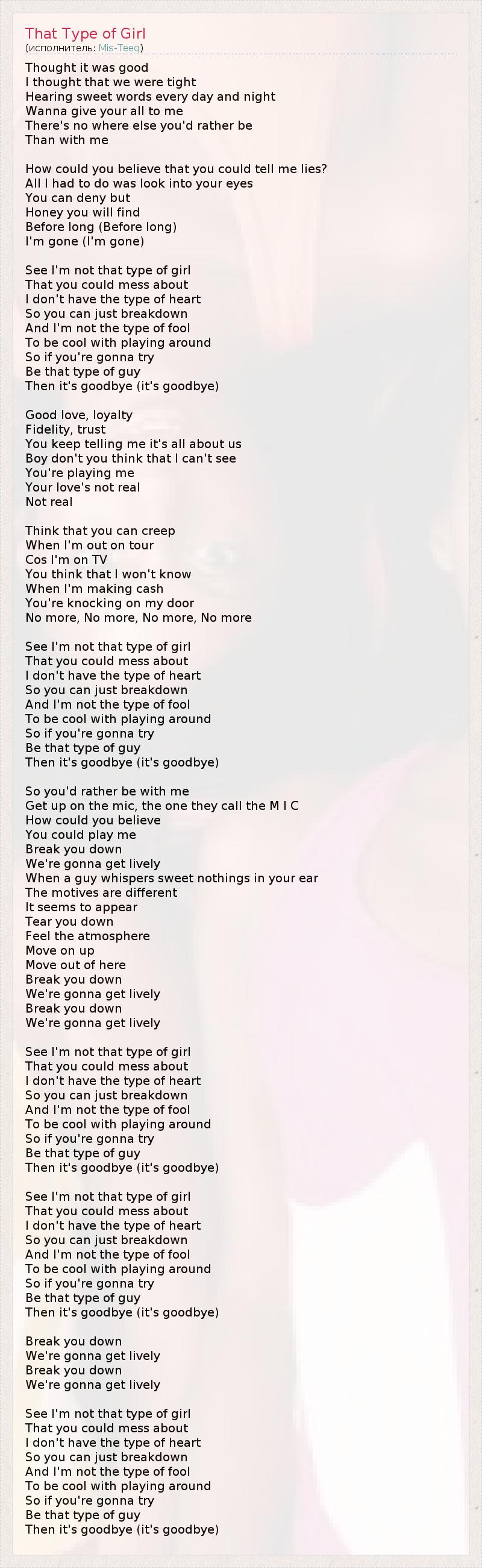 А как ты думаешь, о чем песня "That Type of Girl" ?