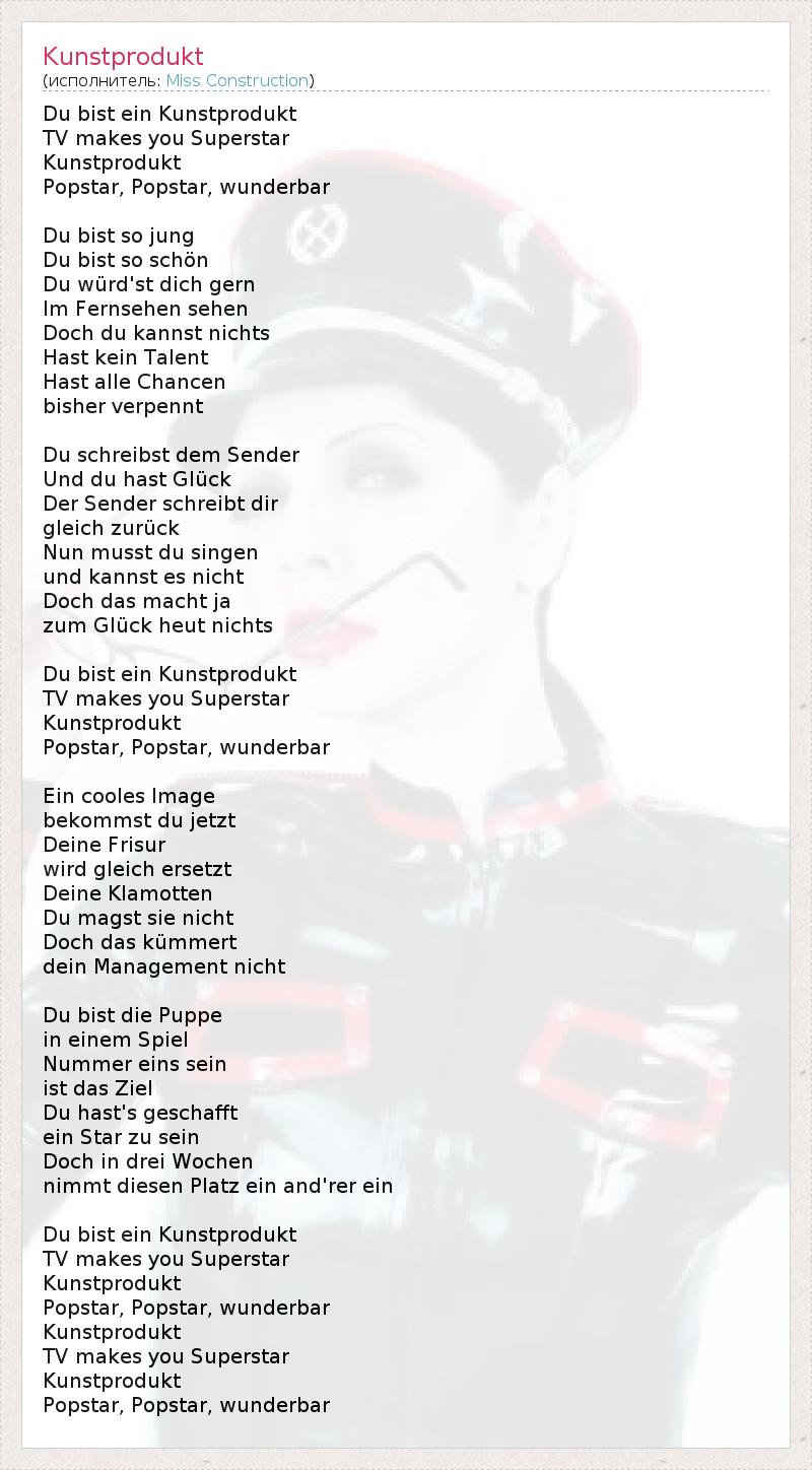 Du bist ein Kunstprodukt TV makes you Superstar Kunstprodukt Popstar, Popstar, wunderbar Du bist so jung Du bist so schön Du würd'st dich gern Im Fernsehen sehen Doch du kannst nichts Hast kein Talent Hast alle Chancen bisher verpennt Du schreibst dem Sender Und du hast Glück Der Sender schreibt dir gleich zurück Nun musst du singen und kannst es nicht Doch das macht ja zum Glück heut nichts Du bist ein Kunstprodukt TV makes you Superstar Kunstprodukt Popstar, Popstar, wunderbar Ein cooles Image bekommst du jetzt Deine Frisur wird gleich ersetzt Deine Klamotten Du magst sie nicht Doch das kümmert dein Management nicht Du bist die Puppe in einem Spiel Nummer eins sein ist das Ziel Du hast's geschafft ein Star zu sein Doch in drei Wochen nimmt diesen Platz ein and'rer ein Du bist ein Kunstprodukt TV makes you Superstar Kunstprodukt Popstar, Popstar, wunderbar Kunstprodukt TV makes you Superstar Kunstprodukt Popstar, Popstar, wunderbar